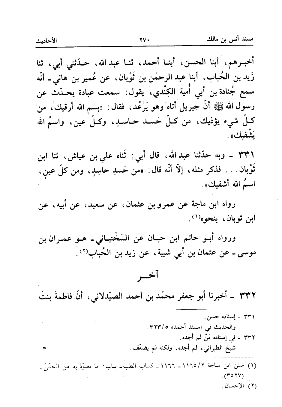 ٣٣١ - وَبِهِ حَدَّثَنَا عَبْدُ اللهِ، قَالَ أَبِي: ثَنَاهُ عَلِيُّ بْنُ عَيَّاشٍ، ثَنَا ابْنُ ثَوْبَانَ فَذَكَرَ مِثْلَهُ إِلَّا أَنَّهُ قَالَ: مِنْ حَسَدِ حَاسِدٍ، وَمِنْ كُلِّ عَيْنٍ، اسْمُ اللهِ يَشْفِيكَ (١).