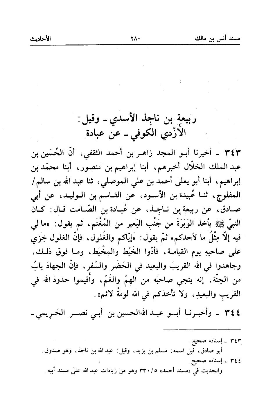 - بِالْحَرِيمِ - أَنَّ هِبَةَ اللهِ أَخْبَرَهُمْ، أَبْنَا الْحَسَنُ، أَبْنَا أَحْمَدُ، ثَنَا عَبْدُ اللهِ، حَدَّثَنِي عَبْدُ اللهِ بْنُ سَالِمٍ الْكُوفِيُّ الْمَفْلُوجُ - وَكَانَ ثِقَةً - ثَنَا عُبَيْدَةُ بْنُ الْأَسْوَدِ، عَنِ الْقَاسِمِ بْنِ الْوَلِيدِ، عَنْ أَبِي صَادِقٍ، عَنْ رَبِيعَةَ بْنِ نَاجِذٍ، عَنْ عُبَادَةَ بْنِ الصَّامِتِ: أَنَّ النَّبِيَّ - صَلَّى اللهُ عَلَيْهِ وَسَلَّمَ - «كَانَ يَأْخُذُ الْوَبَرَةَ مِنْ جَنْبِ الْبَعِيرِ مِنَ الْمَغْنَمِ ثُمَّ يَقُولُ: (مَا لِي فِيهِ إِلَّا مِثْلُ مَا لِأَحَدِكُمْ مِنْهُ، إِيَّاكُمْ وَالْغُلُولَ، فَإِنَّ الْغُلُولَ خِزْيٌ عَلَى صَاحِبِهِ يَوْمَ الْقِيَامَةِ، أَدُّوا الْخَيْطَ وَالْمِخْيَطَ وَمَا فَوْقَ ذَلِكَ، وَجَاهِدُوا فِي سَبِيلِ اللهِ تَعَالَى الْقَرِيبَ وَالْبَعِيدَ فِي الْحَضَرِ وَالسَّفَرِ، فَإِنَّ الْجِهَادَ بَابٌ مِنْ أَبْوَابِ الْجَنَّةِ، إِنَّهُ لَيُنَجِّي اللهُ تَبَارَكَ وَتَعَالَى بِهِ مِنَ الْهَمِّ وَالْغَمِّ، وَأَقِيمُوا حُدُودَ اللهِ فِي الْقَرِيبِ وَالْبَعِيدِ وَلَا تَأْخُذْكُمْ فِي اللهِ لَوْمَةُ لَائِمٍ»).