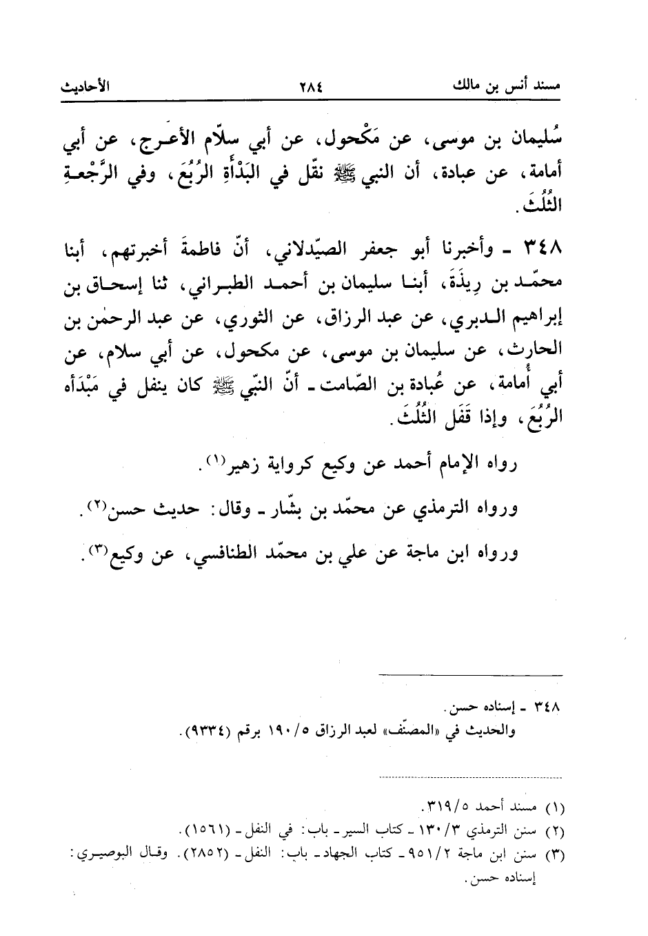 ٣٤٨ - وَأَخْبَرَنَا أَبُو جَعْفَرٍ الصَّيْدَلَانِيُّ، أَنَّ فَاطِمَةَ أَخْبَرَتْهُمْ، أَبْنَا مُحَمَّدُ بْنُ رِيذَةَ، أَبْنَا سُلَيْمَانُ بْنُ أَحْمَدَ الطَّبَرَانِيُّ، ثَنَا إِسْحَاقُ بْنُ إِبْرَاهِيمَ الدَّبَرِيُّ، عَنْ عَبْدِ الرَّزَّاقِ، عَنِ الثَّوْرِيِّ، عَنْ عَبْدِ الرَّحْمَنِ بْنِ الْحَارِثِ، عَنْ سُلَيْمَانَ بْنِ مُوسَى، عَنْ مَكْحُولٍ، عَنْ أَبِي سَلَّامٍ، عَنْ أَبِي أُمَامَةَ، عَنْ عُبَادَةَ بْنِ الصَّامِتِ: أَنَّ النَّبِيَّ - صَلَّى اللهُ عَلَيْهِ وَسَلَّمَ - «كَانَ يُنَفِّلُ فِي مَبْدَئِهِ الرُّبُعَ، وَإِذَا قَفَلَ الثُّلُثَ».