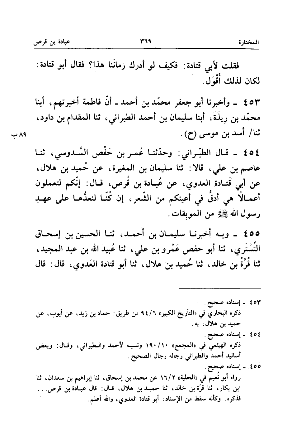 ٤٥٥ - وَبِهِ أَخْبَرَنَا سُلَيْمَانُ بْنُ أَحْمَدَ، ثَنَا الْحُسَيْنُ بْنُ إِسْحَاقَ التُّسْتَرِيُّ، ثَنَا أَبُو حَفْصٍ عَمْرُو بْنُ عَلِيٍّ، ثَنَا عُبَيْدُ اللهِ بْنُ عَبْدِ الْمَجِيدِ، ثَنَا قُرَّةُ بْنُ خَالِدٍ، ثَنَا حُمَيْدُ بْنُ هِلَالٍ، ثَنَا أَبُو قَتَادَةَ الْعَدَوِيُّ قَالَ: قَالَ