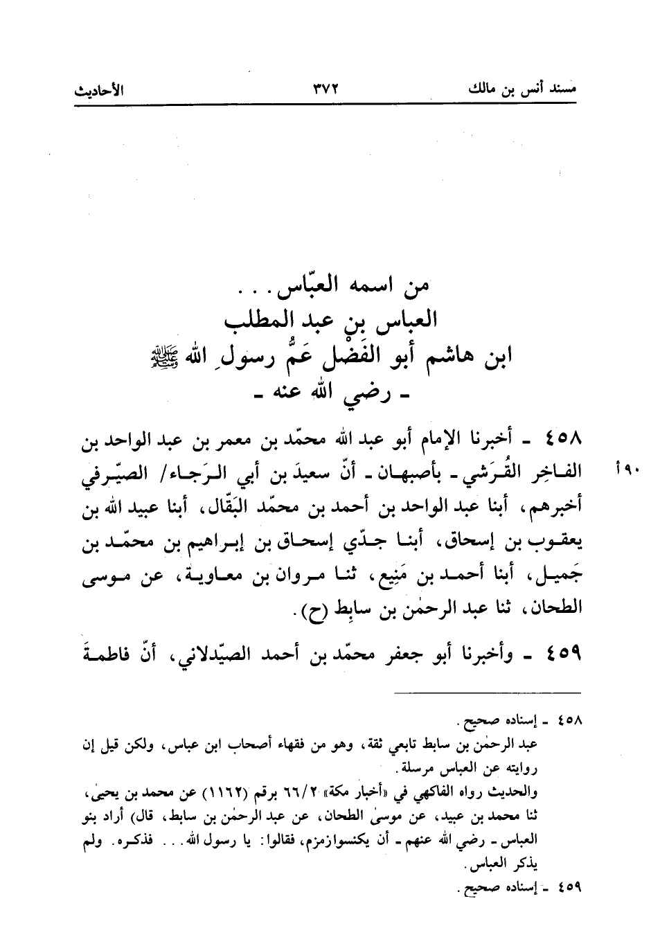 ٤٥٨ - أَخْبَرَنَا الْإِمَامُ أَبُو عَبْدِ اللهِ مُحَمَّدُ بْنُ مَعْمَرِ بْنِ عَبْدِ الْوَاحِدِ بْنِ الْفَاخِرِ الْقُرَشِيُّ - بِأَصْبَهَانَ - أَنَّ سَعِيدَ بْنَ أَبِي الرَّجَاءِ الصَّيْرَفِيَّ أَخْبَرَهُمْ، أَبْنَا عَبْدُ الْوَاحِدِ بْنُ أَحْمَدَ بْنِ مُحَمَّدٍ الْبَقَّالُ، أَبْنَا عُبَيْدُ اللهِ بْنُ يَعْقُوبَ بْنِ إِسْحَاقَ، أَبْنَا جَدِّي إِسْحَاقُ بْنُ إِبْرَاهِيمَ بْنِ مُحَمَّدِ بْنِ جَمِيلٍ، أَبْنَا أَحْمَدُ بْنُ مَنِيعٍ، ثَنَا مَرْوَانُ بْنُ مُعَاوِيَةَ، عَنْ مُوسَى الطَّحَّانِ، ثَنَا عَبْدُ الرَّحْمَنِ بْنُ سَابِطٍ (ح).