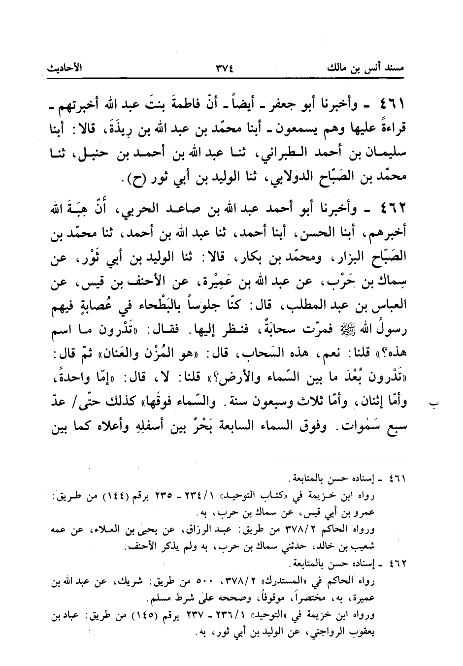 ٤٦٢ - وَأَخْبَرَنَا أَبُو أَحْمَدَ عَبْدُ اللهِ بْنُ صَاعِدٍ الْحَرْبِيُّ، أَنَّ هِبَةَ اللهِ أَخْبَرَهُمْ، أَبْنَا الْحَسَنُ، أَبْنَا أَحْمَدُ، ثَنَا عَبْدُ اللهِ بْنُ أَحْمَدَ، ثَنَا مُحَمَّدُ بْنُ الصَّبَّاحِ الْبَزَّارُ، وَمُحَمَّدُ بْنُ بَكَّارٍ قَالَا: ثَنَا الْوَلِيدُ بْنُ أَبِي ثَوْرٍ، عَنْ سِمَاكِ بْنِ حَرْبٍ، عَنْ عَبْدِ اللهِ بْنِ عَمِيرَةَ، عَنِ الْأَحْنَفِ بْنِ قَيْسٍ، عَنِ الْعَبَّاسِ بْنِ عَبْدِ الْمُطَّلِبِ قَالَ: «كُنَّا جُلُوسًا بِالْبَطْحَاءِ فِي عِصَابَةٍ فِيهِمْ رَسُولُ اللهِ - صَلَّى اللهُ عَلَيْهِ وَسَلَّمَ - فَمَرَّتْ سَحَابَةٌ فَنَظَرَ إِلَيْهَا فَقَالَ: (تَدْرُونَ مَا اسْمُ هَذِهِ؟ ) قُلْنَا: نَعَمْ، هَذِهِ السَّحَابُ، قَالَ: (هُوَ الْمُزْنُ وَالْعَنَانُ) ثُمَّ قَالَ: (تَدْرُونَ بُعْدَ مَا بَيْنَ السَّمَاءِ وَالْأَرْضِ؟ ) قُلْنَا: لَا، قَالَ: (إِمَّا وَاحِدَةٌ وَإِمَّا اثْنَانِ وَإِمَّا ثَلَاثٌ وَسَبْعُونَ سَنَةً، وَالسَّمَاءُ فَوْقَهَا) كَذَلِكَ حَتَّى عَدَّ سَبْعَ سَمَاوَاتٍ، وَفَوْقَ السَّمَاءِ السَّابِعَةِ بَحْرٌ بَيْنَ أَسْفَلِهِ وَأَعْلَاهُ كَمَا بَيْنَ