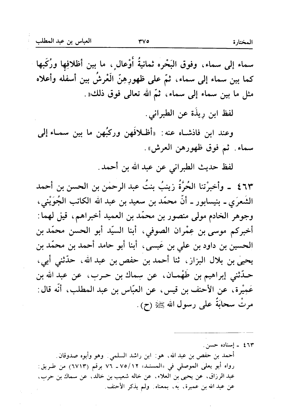 ٤٦٣ - وَأَخْبَرَتْنَا الْحُرَّةُ زَيْنَبُ بِنْتُ عَبْدِ الرَّحْمَنِ بْنِ الْحَسَنِ بْنِ أَحْمَدَ الشَّعَرِيُّ - بِنَيْسَابُورَ - أَنَّ مُحَمَّدَ بْنَ سَعِيدِ بْنِ عَبْدِ اللهِ الْكَاتِبَ الْجُوَيْنِيَّ، وَجَوْهَرًا الْخَادِمَ مَوْلَى مَنْصُورِ بْنِ مُحَمَّدِ بْنِ الْعَمِيدِ أَخْبَرَاهُمْ، قِيلَ لَهُمَا: أَخْبَرَكُمْ مُوسَى بْنُ عِمْرَانَ الصُّوفِيُّ، أَبْنَا السَّيِّدُ أَبُو الْحَسَنِ مُحَمَّدُ بْنُ الْحُسَيْنِ بْنِ دَاوُدَ بْنِ عَلِيِّ بْنِ عِيسَى، أَبْنَا أَبُو حَامِدٍ أَحْمَدُ بْنُ مُحَمَّدِ بْنِ يَحْيَى بْنِ بِلَالٍ الْبَزَّازُ، ثَنَا أَحْمَدُ بْنُ حَفْصِ بْنِ عَبْدِ اللهِ، حَدَّثَنِي أَبِي، حَدَّثَنِي إِبْرَاهِيمُ بْنُ طَهْمَانَ، عَنْ سِمَاكِ بْنِ حَرْبٍ، عَنْ عَبْدِ اللهِ بْنِ عَمِيرَةَ، عَنِ الْأَحْنَفِ بْنِ قَيْسٍ، عَنِ الْعَبَّاسِ بْنِ عَبْدِ الْمُطَّلِبِ أَنَّهُ قَالَ: مَرَّتْ سَحَابَةٌ عَلَى رَسُولِ اللهِ - صَلَّى اللهُ عَلَيْهِ وَسَلَّمَ - (ح).