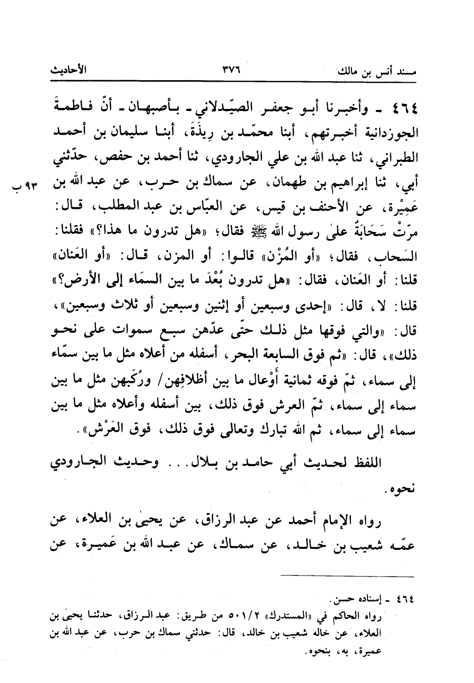٤٦٤ - وَأَخْبَرَنَا أَبُو جَعْفَرٍ الصَّيْدَلَانِيُّ - بِأَصْبَهَانَ - أَنَّ فَاطِمَةَ الْجُوزْدَانِيَّةَ أَخْبَرَتْهُمْ، أَبْنَا مُحَمَّدُ بْنُ رِيذَةَ، أَبْنَا سُلَيْمَانُ بْنُ أَحْمَدَ الطَّبَرَانِيُّ، ثَنَا عَبْدُ اللهِ بْنُ عَلِيٍّ الْجَارُودِيُّ، ثَنَا أَحْمَدُ بْنُ حَفْصٍ، حَدَّثَنِي أَبِي، ثَنَا إِبْرَاهِيمُ بْنُ طَهْمَانَ، عَنْ سِمَاكِ بْنِ حَرْبٍ، عَنْ عَبْدِ اللهِ بْنِ عَمِيرَةَ، عَنِ الْأَحْنَفِ بْنِ قَيْسٍ، عَنِ الْعَبَّاسِ بْنِ عَبْدِ الْمُطَّلِبِ قَالَ: «مَرَّتْ سَحَابَةٌ عَلَى رَسُولِ اللهِ - صَلَّى اللهُ عَلَيْهِ وَسَلَّمَ - فَقَالَ: (هَلْ تَدْرُونَ مَا هَذَا؟ ) فَقُلْنَا: السَّحَابُ، فَقَالَ: (أَوِ الْمُزْنُ) قَالُوا: أَوِ الْمُزْنُ، قَالَ: (أَوِ الْعَنَانُ) قُلْنَا: أَوِ الْعَنَانُ، فَقَالَ: (هَلْ تَدْرُونَ بُعْدَ مَا بَيْنَ السَّمَاءِ إِلَى الْأَرْضِ؟ ) قُلْنَا: لَا، قَالَ: (إِحْدَى وَسَبْعِينَ أَوِ اثْنَيْنِ وَسَبْعِينَ أَوْ ثَلَاثًا وَسَبْعِينَ) قَالَ: (وَالَّتِي فَوْقَهَا مِثْلُ ذَلِكَ حَتَّى عَدَّهُنَّ سَبْعَ سَمَاوَاتٍ عَلَى نَحْوِ ذَلِكَ) قَالَ: (ثُمَّ فَوْقَ السَّابِعَةِ الْبَحْرُ، أَسْفَلُهُ مِنْ أَعْلَاهُ مِثْلُ مَا بَيْنَ سَمَاءٍ إِلَى سَمَاءٍ، ثُمَّ فَوْقَهُ ثَمَانِيَةُ أَوْعَالٍ مَا بَيْنَ أَظْلَافِهِنْ وَرُكَبِهِنَّ مِثْلُ مَا بَيْنَ سَمَاءٍ إِلَى سَمَاءٍ، ثُمَّ الْعَرْشُ فَوْقَ ذَلِكَ، بَيْنَ أَسْفَلِهِ وَأَعْلَاهُ مِثْلُ مَا بَيْنَ سَمَاءٍ إِلَى سَمَاءٍ، ثُمَّ اللهُ تَبَارَكَ وَتَعَالَى فَوْقَ ذَلِكَ، فَوْقَ الْعَرْشِ»).