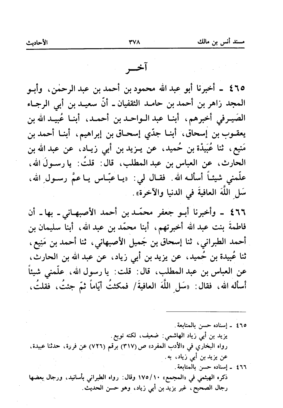 ٤٦٥ - أَخْبَرَنَا أَبُو عَبْدِ اللهِ مَحْمُودُ بْنُ أَحْمَدَ بْنِ عَبْدِ الرَّحْمَنِ، وَأَبُو الْمَجْدِ زَاهِرُ بْنُ أَحْمَدَ بْنِ حَامِدٍ الثَّقَفِيَّانِ، أَنَّ سَعِيدَ بْنَ أَبِي الرَّجَاءِ الصَّيْرَفِيَّ أَخْبَرَهُمْ، أَبْنَا عَبْدُ الْوَاحِدِ بْنُ أَحْمَدَ، أَبْنَا عُبَيْدُ اللهِ بْنُ يَعْقُوبَ بْنِ إِسْحَاقَ، أَبْنَا جَدِّي إِسْحَاقُ بْنُ إِبْرَاهِيمَ، أَبْنَا أَحْمَدُ بْنُ مَنِيعٍ، ثَنَا عَبِيدَةُ بْنُ حُمَيْدٍ، عَنْ يَزِيدَ بْنِ أَبِي زِيَادٍ، عَنْ عَبْدِ اللهِ بْنِ الْحَارِثِ، عَنِ الْعَبَّاسِ بْنِ عَبْدِ الْمُطَّلِبِ قَالَ: «قُلْتُ: يَا رَسُولَ اللهِ عَلِّمْنِي شَيْئًا أَسْأَلُهُ اللهَ، فَقَالَ لِي: (يَا عَبَّاسُ يَا عَمَّ رَسُولِ اللهِ، سَلِ اللهَ الْعَافِيَةَ فِي الدُّنْيَا وَالْآخِرَةِ»).