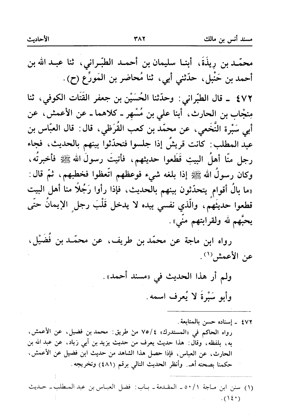 ٤٧٢ - قَالَ الطَّبَرَانِيُّ: وَحَدَّثَنَا الْحُسَيْنُ بْنُ جَعْفَرٍ الْقَتَّاتُ الْكُوفِيُّ، ثَنَا مِنْجَابُ بْنُ الْحَارِثِ، أَبْنَا عَلِيُّ بْنُ مُسْهِرٍ، كِلَاهُمَا، عَنِ الْأَعْمَشِ، عَنْ أَبِي سَبْرَةَ النَّخَعِيِّ، عَنْ مُحَمَّدِ بْنِ كَعْبٍ الْقُرَظِيِّ قَالَ: قَالَ الْعَبَّاسُ بْنُ عَبْدِ الْمُطَّلِبِ: «كَانَتْ قُرَيْشٌ إِذَا جَلَسُوا فَتَحَدَّثُوا بَيْنَهُمْ بِالْحَدِيثِ فَجَاءَ رَجُلٌ مِنَّا أَهْلَ الْبَيْتِ قَطَعُوا حَدِيثَهُمْ، فَأَتَيْتُ رَسُولَ اللهِ - صَلَّى اللهُ عَلَيْهِ وَسَلَّمَ - فَأَخْبَرْتُهُ، وَكَانَ رَسُولُ اللهِ - صَلَّى اللهُ عَلَيْهِ وَسَلَّمَ - إِذَا بَلَغَهُ شَيْءٌ فَوَعَظَهُمُ اتَّعَظُوا، فَخَطَبَهُمْ ثُمَّ قَالَ: (مَا بَالُ أَقْوَامٍ يَتَحَدَّثُونَ بَيْنَهُمْ بِالْحَدِيثِ فَإِذَا رَأَوْا رَجُلًا مِنَّا أَهْلَ الْبَيْتِ قَطَعُوا حَدِيثَهُمْ، وَالَّذِي نَفْسِي بِيَدِهِ لَا يَدْخُلُ قَلْبَ رَجُلٍ الْإِيمَانُ حَتَّى يُحِبَّهُمْ لِلهِ وَلِقَرَابَتِهِمْ مِنِّي»).