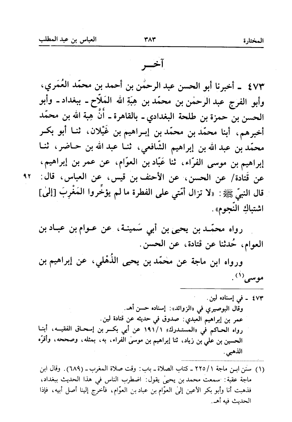 ٤٧٣ - أَخْبَرَنَا أَبُو الْحَسَنِ عَبْدُ الرَّحْمَنِ بْنُ أَحْمَدَ بْنِ مُحَمَّدٍ الْعُمَرِيُّ، وَأَبُو الْفَرَجِ عَبْدُ الرَّحْمَنِ بْنُ مُحَمَّدِ بْنِ هِبَةِ اللهِ الْمَلَّاحُ - بِبَغْدَادَ - وَأَبُو الْحَسَنِ بْنُ حَمْزَةَ بْنِ طَلْحَةَ الْبَغْدَادِيُّ - بِالْقَاهِرَةِ - أَنَّ هِبَةَ اللهِ بْنَ مُحَمَّدٍ أَخْبَرَهُمْ، أَبْنَا مُحَمَّدُ بْنُ مُحَمَّدِ بْنِ إِبْرَاهِيمَ بْنِ غَيْلَانَ، ثَنَا أَبُو بَكْرٍ مُحَمَّدُ بْنُ عَبْدِ اللهِ بْنِ إِبْرَاهِيمَ الشَّافِعِيُّ، ثَنَا عَبْدُ اللهِ بْنُ حَاضِرٍ، ثَنَا إِبْرَاهِيمُ بْنُ مُوسَى الْفَرَّاءُ، ثَنَا عَبَّادُ بْنُ الْعَوَّامِ، عَنْ عُمَرَ بْنِ إِبْرَاهِيمَ، عَنْ قَتَادَةَ، عَنِ الْحَسَنِ، عَنِ الْأَحْنَفِ بْنِ قَيْسٍ، عَنِ الْعَبَّاسِ قَالَ: قَالَ النَّبِيُّ - صَلَّى اللهُ عَلَيْهِ وَسَلَّمَ -: («لَا تَزَالُ أُمَّتِي عَلَى الْفِطْرَةِ مَا لَمْ يُؤَخِّرُوا الْمَغْرِبَ [إِلَى] اشْتِبَاكِ النُّجُومِ»).