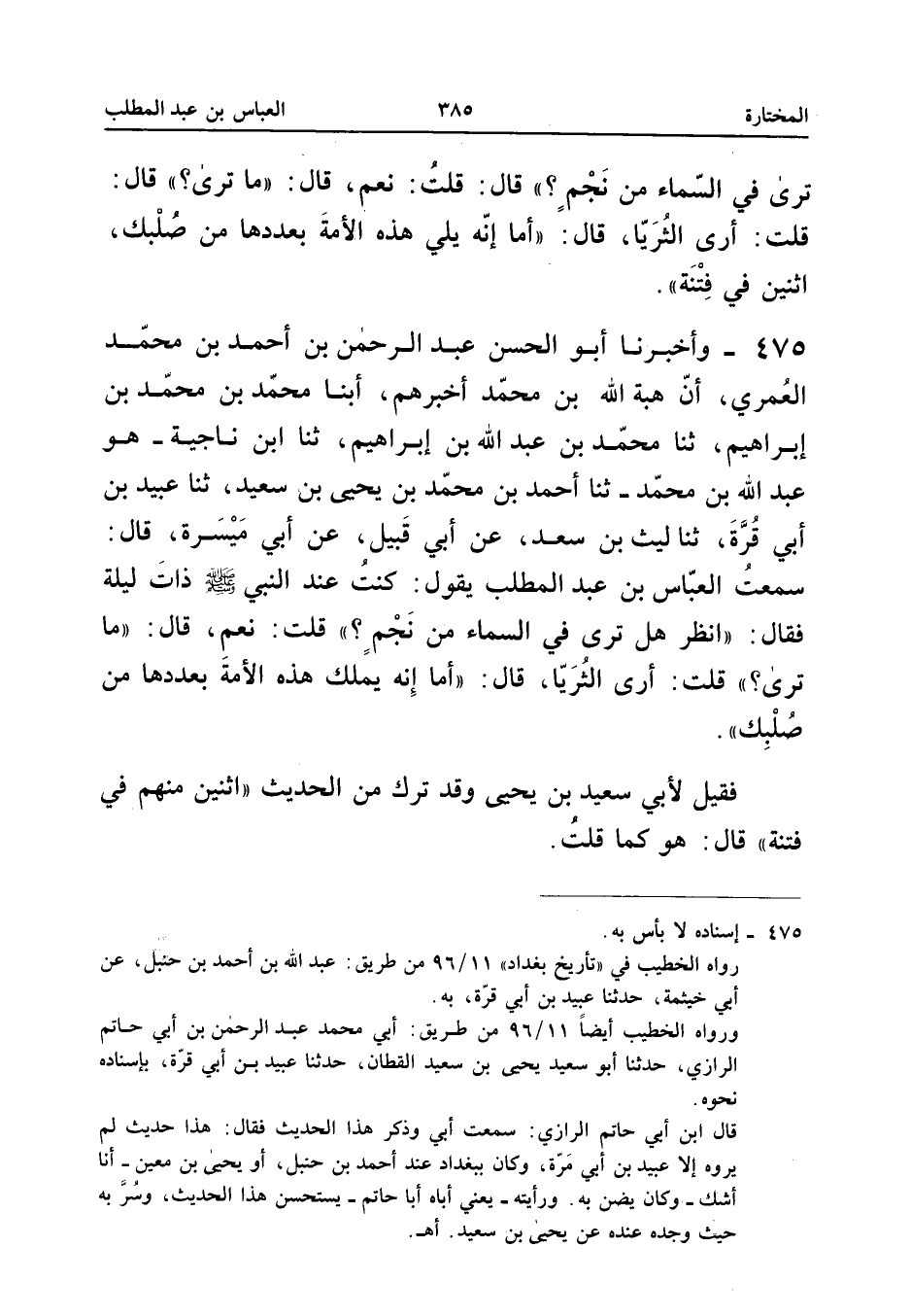 ٤٧٥ - وَأَخْبَرَنَا أَبُو الْحَسَنِ عَبْدُ الرَّحْمَنِ بْنُ أَحْمَدَ بْنِ مُحَمَّدٍ الْعُمَرِيُّ، أَنَّ هِبَةَ اللهِ بْنَ مُحَمَّدٍ أَخْبَرَهُمْ، أَبْنَا مُحَمَّدُ بْنُ مُحَمَّدِ بْنِ إِبْرَاهِيمَ، ثَنَا مُحَمَّدُ بْنُ عَبْدِ اللهِ بْنِ إِبْرَاهِيمَ، ثَنَا ابْنُ نَاجِيَةَ - هُوَ عَبْدُ اللهِ بْنُ مُحَمَّدٍ - ثَنَا أَحْمَدُ بْنُ مُحَمَّدِ بْنِ يَحْيَى بْنِ سَعِيدٍ، ثَنَا عُبَيْدُ بْنُ أَبِي قُرَّةَ، ثَنَا لَيْثُ بْنُ سَعْدٍ، عَنْ أَبِي قَبِيلٍ، عَنْ أَبِي مَيْسَرَةَ قَالَ: سَمِعْتُ الْعَبَّاسَ بْنَ عَبْدِ الْمُطَّلِبِ يَقُولُ: «كُنْتُ عِنْدَ النَّبِيِّ - صَلَّى اللهُ عَلَيْهِ وَسَلَّمَ - ذَاتَ لَيْلَةٍ فَقَالَ: (انْظُرْ هَلْ تَرَى فِي السَّمَاءِ مِنْ نَجْمٍ؟ ) قُلْتُ: نَعَمْ، قَالَ: (مَا تَرَى؟ ) قُلْتُ: أَرَى الثُّرَيَّا، قَالَ: (أَمَا إِنَّهُ يَمْلِكُ هَذِهِ الْأُمَّةَ بِعَدَدِهَا مِنْ صُلْبِكَ»).