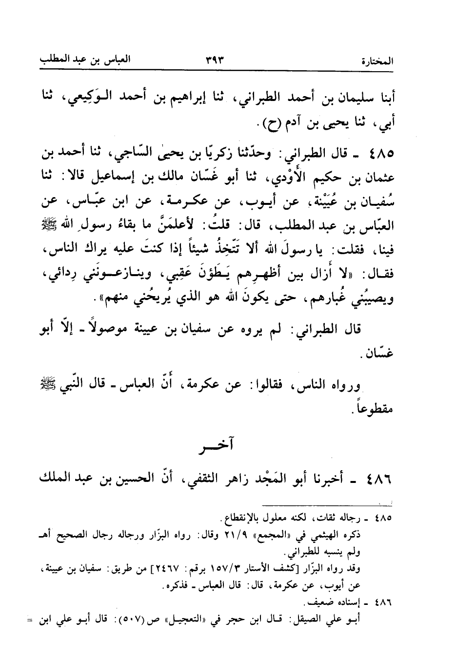 ٤٨٥ - قَالَ الطَّبَرَانِيُّ: وَحَدَّثَنَا زَكَرِيَّا بْنُ يَحْيَى السَّاجِيُّ، ثَنَا أَحْمَدُ بْنُ عُثْمَانَ بْنِ حَكِيمٍ الْأَوْدِيُّ، ثَنَا أَبُو غَسَّانَ مَالِكُ بْنُ إِسْمَاعِيلَ قَالَا: ثَنَا سُفْيَانُ بْنُ عُيَيْنَةَ، عَنْ أَيُّوبَ، عَنْ عِكْرِمَةَ، عَنِ ابْنِ عَبَّاسٍ، عَنِ الْعَبَّاسِ بْنِ عَبْدِ الْمُطَّلِبِ قَالَ: «قُلْتُ: لَأَعْلَمَنَّ مَا بَقَاءُ رَسُولِ اللهِ - صَلَّى اللهُ عَلَيْهِ وَسَلَّمَ - فِينَا، فَقُلْتُ: يَا رَسُولَ اللهِ أَلَا تَتَّخِذُ شَيْئًا إِذَا كُنْتَ عَلَيْهِ يَرَاكَ النَّاسُ، فَقَالَ: (لَا أَزَالُ بَيْنَ أَظْهُرِهِمْ يَطَؤُونَ عَقِبِي، وَيُنَازِعُونَنِي رِدَائِي، وَيُصِيبُنِي غُبَارُهُمْ، حَتَّى يَكُونَ اللهُ هُوَ الَّذِي يُرِيحُنِي مِنْهُمْ»).