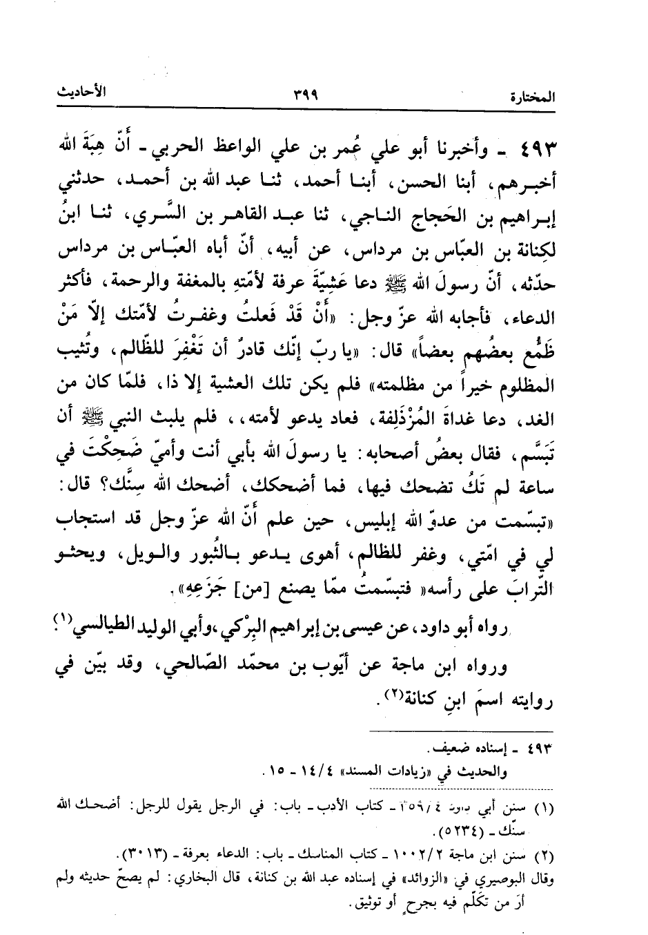٤٩٣ - وَأَخْبَرَنَا أَبُو عَلِيٍّ عُمَرُ بْنُ عَلِيٍّ الْوَاعِظُ الْحَرْبِيُّ، أَنَّ هِبَةَ اللهِ أَخْبَرَهُمْ، أَبْنَا الْحَسَنُ، أَبْنَا أَحْمَدُ، ثَنَا عَبْدُ اللهِ بْنُ أَحْمَدَ، حَدَّثَنِي إِبْرَاهِيمُ بْنُ الْحَجَّاجِ النَّاجِيُّ، ثَنَا عَبْدُ الْقَاهِرِ بْنُ السَّرِيِّ، ثَنَا ابْنٌ لِكِنَانَةَ بْنِ الْعَبَّاسِ بْنِ مِرْدَاسٍ، عَنْ أَبِيهِ، أَنَّ أَبَاهُ الْعَبَّاسَ بْنَ مِرْدَاسٍ حَدَّثَهُ: «أَنَّ رَسُولَ اللهِ - صَلَّى اللهُ عَلَيْهِ وَسَلَّمَ - دَعَا عَشِيَّةَ عَرَفَةَ لِأُمَّتِهِ بِالْمَغْفِرَةِ وَالرَّحْمَةِ، فَأَكْثَرَ الدُّعَاءَ، فَأَجَابَهُ اللهُ عَزَّ وَجَلَّ: (أَنْ قَدْ فَعَلْتُ وَغَفَرْتُ لِأُمَّتِكَ إِلَّا مَنْ ظَلَمَ بَعْضُهُمْ بَعْضًا) قَالَ: (يَا رَبِّ إِنَّكَ قَادِرٌ أَنْ تَغْفِرَ لِلظَّالِمِ، وَتُثِيبَ الْمَظْلُومَ خَيْرًا مِنْ مَظْلَمَتِهِ) فَلَمْ يَكُنْ تِلْكَ الْعَشِيَّةَ إِلَّا ذَا، فَلَمَّا كَانَ مِنَ الْغَدِ دَعَا غَدَاةَ الْمُزْدَلِفَةِ فَعَادَ يَدْعُو لِأُمَّتِهِ، فَلَمْ يَلْبَثِ النَّبِيُّ - صَلَّى اللهُ عَلَيْهِ وَسَلَّمَ - أَنْ تَبَسَّمَ، فَقَالَ بَعْضُ أَصْحَابِهِ: يَا رَسُولَ اللهِ بِأَبِي أَنْتَ وَأُمِّي ضَحِكْتَ فِي سَاعَةٍ لَمْ تَكُ تَضْحَكُ فِيهَا، فَمَا أَضْحَكَكَ، أَضْحَكَ اللهُ سِنَّكَ؟ قَالَ: (تَبَسَّمْتُ مِنْ عَدُوِّ اللهِ إِبْلِيسَ حِينَ عَلِمَ أَنَّ اللهَ عَزَّ وَجَلَّ قَدِ اسْتَجَابَ لِي فِي أُمَّتِي وَغَفَرَ لِلظَّالِمِ، أَهْوَى يَدْعُو بِالثُّبُورِ وَالْوَيْلِ وَيَحْثُو التُّرَابَ عَلَى رَأْسِهِ، فَتَبَسَّمْتُ مِمَّا يَصْنَعُ [مِنْ] جَزَعِهِ)».