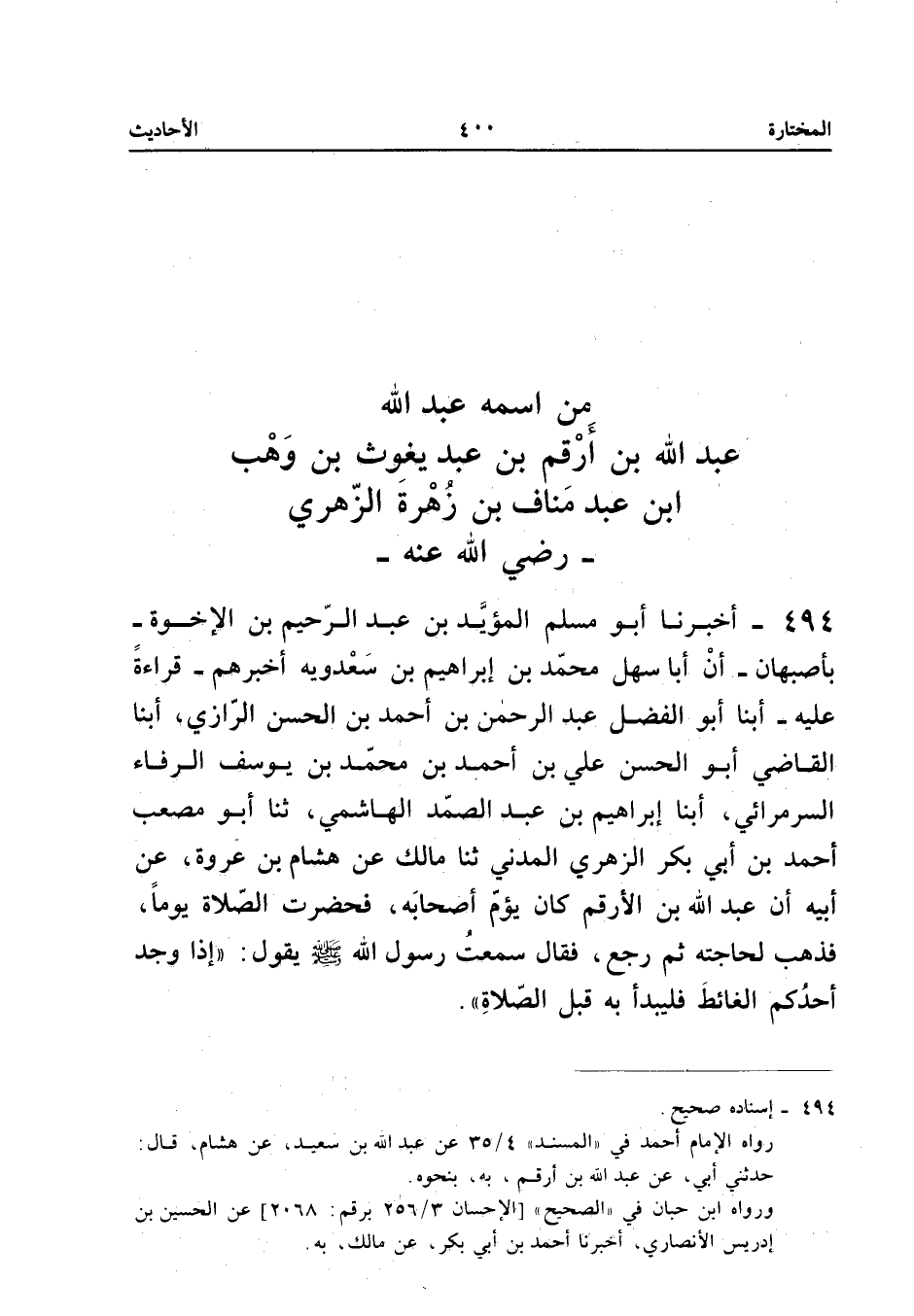 ٤٩٤ - أَخْبَرَنَا أَبُو مُسْلِمٍ الْمُؤَيَّدُ بْنُ عَبْدِ الرَّحِيمِ بْنِ الْإِخْوَةِ - بِأَصْبَهَانَ - أَنَّ أَبَا سَهْلٍ مُحَمَّدَ بْنَ إِبْرَاهِيمَ بْنِ سَعْدَوَيْهِ أَخْبَرَهُمْ - قِرَاءَةً عَلَيْهِ - أَبْنَا أَبُو الْفَضْلِ عَبْدُ الرَّحْمَنِ بْنُ أَحْمَدَ بْنِ الْحَسَنِ الرَّازِيُّ، أَبْنَا الْقَاضِي أَبُو الْحَسَنِ عَلِيُّ بْنُ أَحْمَدَ بْنِ مُحَمَّدِ بْنِ يُوسُفَ الرَّفَّاءُ السُّرَّمَرَّائِيُّ، أَبْنَا إِبْرَاهِيمُ بْنُ عَبْدِ الصَّمَدِ الْهَاشِمِيُّ، ثَنَا أَبُو مُصْعَبٍ أَحْمَدُ بْنُ أَبِي بَكْرٍ الزُّهْرِيُّ الْمَدَنِيُّ، ثَنَا مَالِكٌ، عَنْ هِشَامِ بْنِ عُرْوَةَ، عَنْ أَبِيهِ أَنَّ عَبْدَ اللهِ بْنَ الْأَرْقَمِ «كَانَ يَؤُمُّ أَصْحَابَهُ فَحَضَرَتِ الصَّلَاةُ يَوْمًا فَذَهَبَ لِحَاجَتِهِ ثُمَّ رَجَعَ فَقَالَ: سَمِعْتُ رَسُولَ اللهِ - صَلَّى اللهُ عَلَيْهِ وَسَلَّمَ - يَقُولُ: (إِذَا وَجَدَ أَحَدُكُمُ الْغَائِطَ فَلْيَبْدَأْ بِهِ قَبْلَ الصَّلَاةِ»).