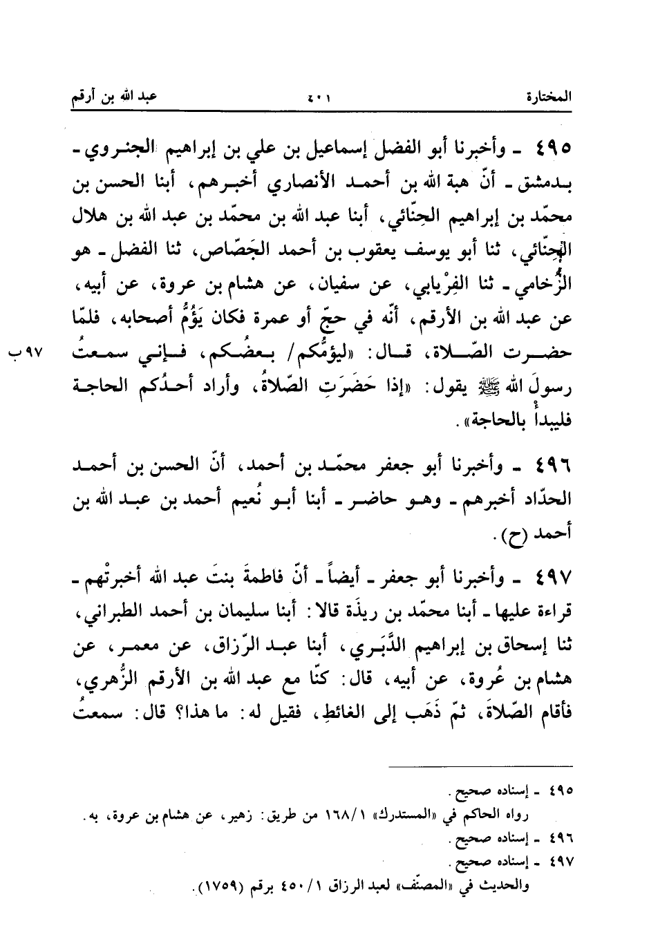 ٤٩٥ - وَأَخْبَرَنَا أَبُو الْفَضْلِ إِسْمَاعِيلُ بْنُ عَلِيِّ بْنِ إِبْرَاهِيمَ الْجَنْزَوِيُّ - بِدِمَشْقَ - أَنَّ هِبَةَ اللهِ بْنَ أَحْمَدَ الْأَنْصَارِيَّ أَخْبَرَهُمْ، أَبْنَا الْحَسَنُ بْنُ مُحَمَّدِ بْنِ إِبْرَاهِيمَ الْحِنَّائِيُّ، أَبْنَا عَبْدُ اللهِ بْنُ مُحَمَّدِ بْنِ عَبْدِ اللهِ بْنِ هِلَالٍ الْحِنَّائِيُّ، ثَنَا أَبُو يُوسُفَ يَعْقُوبُ بْنُ أَحْمَدَ الْجَصَّاصُ، ثَنَا الْفَضْلُ - هُوَ الرُّخَامِيُّ - ثَنَا الْفِرْيَابِيُّ، عَنْ سُفْيَانَ، عَنْ هِشَامِ بْنِ عُرْوَةَ، عَنْ أَبِيهِ، عَنْ عَبْدِ اللهِ بْنِ الْأَرْقَمِ: «أَنَّهُ فِي حَجٍّ أَوْ عُمْرَةٍ فَكَانَ يَؤُمُّ أَصْحَابَهُ، فَلَمَّا حَضَرَتِ الصَّلَاةُ قَالَ: (لِيَؤُمَّكُمْ بَعْضُكُمْ، فَإِنِّي سَمِعْتُ رَسُولَ اللهِ - صَلَّى اللهُ عَلَيْهِ وَسَلَّمَ - يَقُولُ: إِذَا حَضَرَتِ الصَّلَاةُ وَأَرَادَ أَحَدُكُمُ الْحَاجَةَ فَلْيَبْدَأْ بِالْحَاجَةِ»).