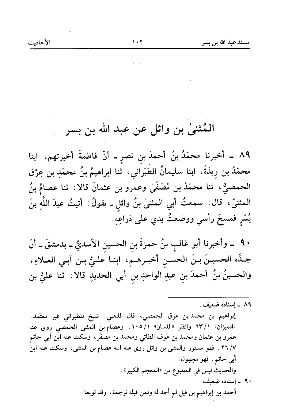 ٨٩ - أَخْبَرَنَا مُحَمَّدُ بْنُ أَحْمَدَ بْنِ نَصْرٍ، أَنَّ فَاطِمَةَ أَخْبَرَتْهُمْ، أَبْنَا مُحَمَّدُ بْنُ رِيذَةَ، أَبْنَا سُلَيْمَانُ الطَّبَرَانِيُّ، ثَنَا إِبْرَاهِيمُ بْنُ مُحَمَّدِ بْنِ عِرْقٍ الْحِمْصِيُّ، ثَنَا مُحَمَّدُ بْنُ مُصَفَّى وَعَمْرُو بْنُ عُثْمَانَ قَالَا: ثَنَا عِصَامُ بْنُ الْمُثَنَّى قَالَ: سَمِعْتُ أَبِي الْمُثَنَّى بْنَ وَائِلٍ يَقُولُ: «أَتَيْتُ عَبْدَ اللهِ بْنَ بُسْرٍ فَمَسَحَ رَأْسِي وَوَضَعْتُ يَدِي عَلَى ذِرَاعِهِ».