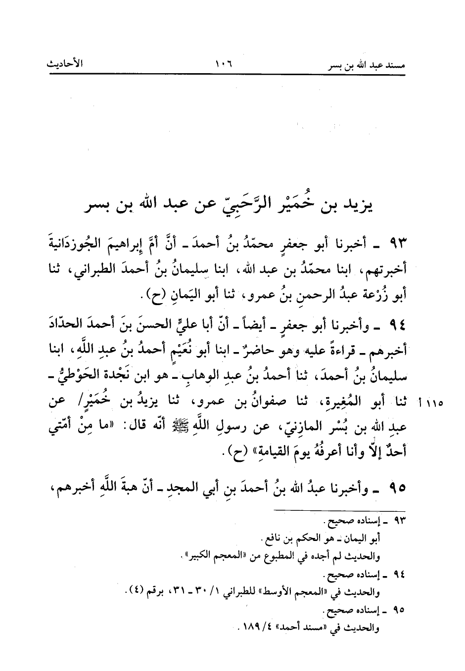 أَبْنَا الْحَسَنُ بْنُ الْمُذْهِبِ، أَبْنَا أَحْمَدُ بْنُ جَعْفَرٍ، ثَنَا عَبْدُ اللهِ، حَدَّثَنِي أَبِي، ثَنَا أَبُو الْمُغِيرَةِ، ثَنَا صَفْوَانُ، حَدَّثَنِي يَزِيدُ بْنُ خُمَيْرٍ، عَنْ عَبْدِ اللهِ بْنِ بُسْرٍ الْمَازِنِيِّ، عَنْ رَسُولِ اللهِ صَلَّى اللهُ عَلَيْهِ وَسَلَّمَ أَنَّهُ قَالَ: «مَا مِنْ أُمَّتِي أَحَدٌ إِلَّا وَأَنَا أَعْرِفُهُ يَوْمَ الْقِيَامَةِ» (ح).