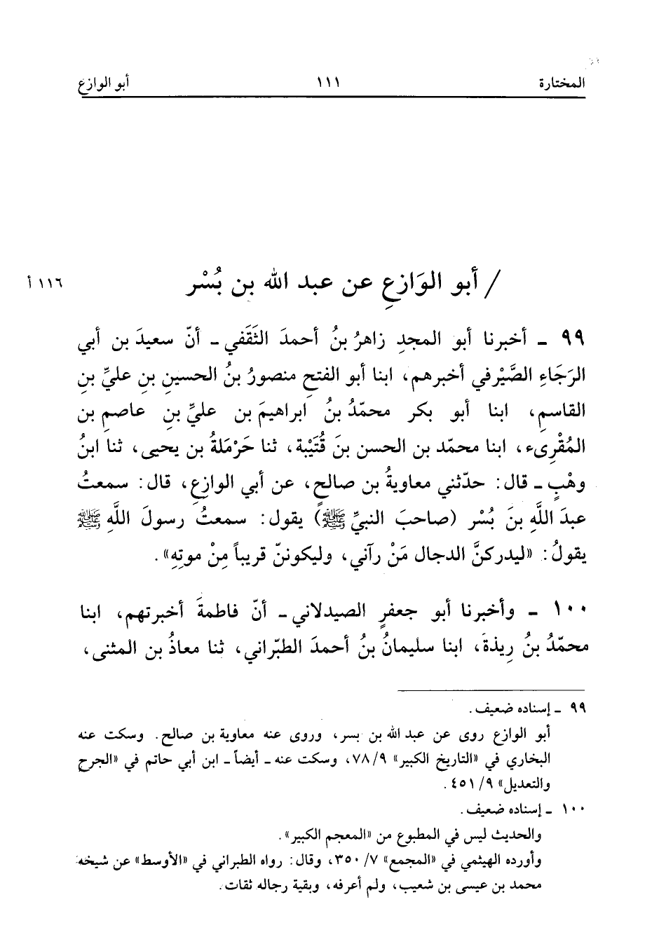 ٩٩ - أَخْبَرَنَا أَبُو الْمَجْدِ زَاهِرُ بْنُ أَحْمَدَ الثَّقَفِيُّ، أَنَّ سَعِيدَ بْنَ أَبِي الرَّجَاءِ الصَّيْرَفِيَّ أَخْبَرَهُمْ، أَبْنَا أَبُو الْفَتْحِ مَنْصُورُ بْنُ الْحُسَيْنِ بْنِ عَلِيِّ بْنِ الْقَاسِمِ، أَبْنَا أَبُو بَكْرٍ مُحَمَّدُ بْنُ إِبْرَاهِيمَ بْنِ عَلِيِّ بْنِ عَاصِمِ بْنِ الْمُقْرِئِ، أَبْنَا مُحَمَّدُ بْنُ الْحَسَنِ بْنِ قُتَيْبَةَ، ثَنَا حَرْمَلَةُ بْنُ يَحْيَى، ثَنَا ابْنُ وَهْبٍ، قَالَ: حَدَّثَنِي مُعَاوِيَةُ بْنُ صَالِحٍ، عَنْ أَبِي الْوَازِعِ قَالَ: سَمِعْتُ عَبْدَ اللهِ بْنَ بُسْرٍ صَاحِبَ النَّبِيِّ صَلَّى اللهُ عَلَيْهِ وَسَلَّمَ يَقُولُ: سَمِعْتُ رَسُولَ اللهِ صَلَّى اللهُ عَلَيْهِ وَسَلَّمَ يَقُولُ: «لَيُدْرِكَنَّ الدَّجَّالُ مَنْ رَآنِي، وَلَيَكُونَنَّ قَرِيبًا مِنْ مَوْتِهِ».
