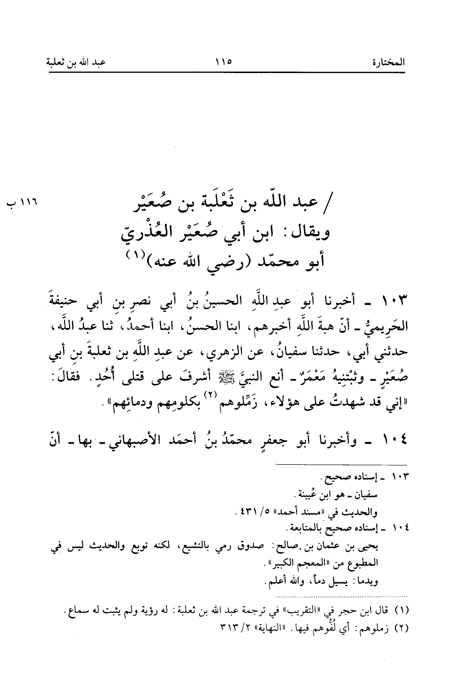 ١٠٣ - أَخْبَرَنَا أَبُو عَبْدِ اللهِ الْحُسَيْنُ بْنُ أَبِي نَصْرِ بْنِ أَبِي حَنِيفَةَ الْحَرِيمِيُّ، أَنَّ هِبَةَ اللهِ أَخْبَرَهُمْ، أَبْنَا الْحَسَنُ، أَبْنَا أَحْمَدُ، ثَنَا عَبْدُ اللهِ، حَدَّثَنِي أَبِي، حَدَّثَنَا سُفْيَانُ، عَنِ الزُّهْرِيِّ، عَنْ عَبْدِ اللهِ بْنِ ثَعْلَبَةَ بْنِ أَبِي صُعَيْرٍ - وَثَبَّتَنِيهِ مَعْمَرٌ - «أَنَّ النَّبِيَّ صَلَّى اللهُ عَلَيْهِ وَسَلَّمَ أَشْرَفَ عَلَى قَتْلَى أُحُدٍ، فَقَالَ: إِنِّي قَدْ شَهِدْتُ عَلَى هَؤُلَاءِ، زَمِّلُوهُمْ بِكُلُومِهِمْ وَدِمَائِهِمْ».