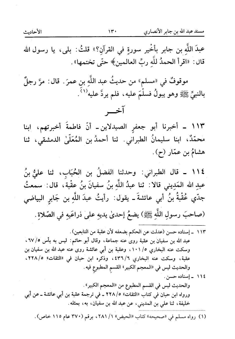 ١١٤ - قَالَ الطَّبَرَانِيُّ: وَحَدَّثَنَا الْفَضْلُ بْنُ الْحُبَابِ، ثَنَا عَلِيُّ بْنُ عَبْدِ اللهِ الْمَدِينِيُّ، قَالَا: ثَنَا عَبْدُ اللهِ بْنُ سُفْيَانَ بْنِ عُقْبَةَ، قَالَ: سَمِعْتُ جَدِّي عُقْبَةَ بْنَ أَبِي عَائِشَةَ يَقُولُ: «رَأَيْتُ عَبْدَ اللهِ بْنَ جَابِرٍ الْبَيَاضِيَّ صَاحِبَ رَسُولِ اللهِ صَلَّى اللهُ عَلَيْهِ وَسَلَّمَ يَضَعُ إِحْدَى يَدَيْهِ عَلَى ذِرَاعَيْهِ فِي الصَّلَاةِ».