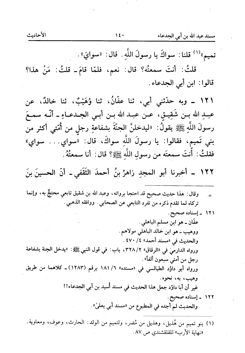 ١٢١ - وَبِهِ حَدَّثَنِي أَبِي، ثَنَا عَفَّانُ، ثَنَا وُهَيْبٌ، ثَنَا خَالِدٌ، عَنْ عَبْدِ اللهِ بْنِ شَقِيقٍ، عَنْ عَبْدِ اللهِ بْنِ أَبِي الْجَدْعَاءِ، أَنَّهُ سَمِعَ رَسُولَ اللهِ صَلَّى اللهُ عَلَيْهِ وَسَلَّمَ يَقُولُ: «لَيَدْخُلَنَّ الْجَنَّةَ بِشَفَاعَةِ رَجُلٍ مِنْ أُمَّتِي أَكْثَرُ مِنْ بَنِي تَمِيمٍ، فَقَالُوا: يَا رَسُولَ اللهِ سِوَاكَ؟ قَالَ: سِوَايَ ... سِوَايَ، فَقُلْتُ: أَنْتَ سَمِعْتَهُ مِنْ رَسُولِ اللهِ صَلَّى اللهُ عَلَيْهِ وَسَلَّمَ؟ قَالَ: أَنَا سَمِعْتُهُ».