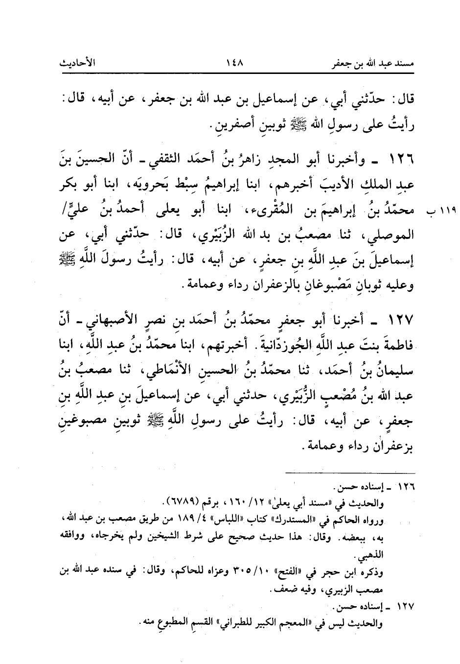 ١٢٦ - وَأَخْبَرَنَا أَبُو الْمَجْدِ زَاهِرُ بْنُ أَحْمَدَ الثَّقَفِيُّ، أَنَّ الْحُسَيْنَ بْنَ عَبْدِ الْمَلِكِ الْأَدِيبَ أَخْبَرَهُمْ، أَبْنَا إِبْرَاهِيمُ سِبْطُ بَحْرَوَيْهِ، أَبْنَا أَبُو بَكْرٍ مُحَمَّدُ بْنُ إِبْرَاهِيمَ بْنِ الْمُقْرِئِ، أَبْنَا أَبُو يَعْلَى أَحْمَدُ بْنُ عَلِيٍّ الْمَوْصِلِيُّ، ثَنَا مُصْعَبُ بْنُ عَبْدِ اللهِ الزُّبَيْرِيُّ قَالَ: حَدَّثَنِي أَبِي، عَنْ إِسْمَاعِيلَ بْنِ عَبْدِ اللهِ بْنِ جَعْفَرٍ، عَنْ أَبِيهِ قَالَ: «رَأَيْتُ رَسُولَ اللهِ صَلَّى اللهُ عَلَيْهِ وَسَلَّمَ وَعَلَيْهِ ثَوْبَانِ مَصْبُوغَانِ بِالزَّعْفَرَانِ، رِدَاءٌ وَعِمَامَةٌ».