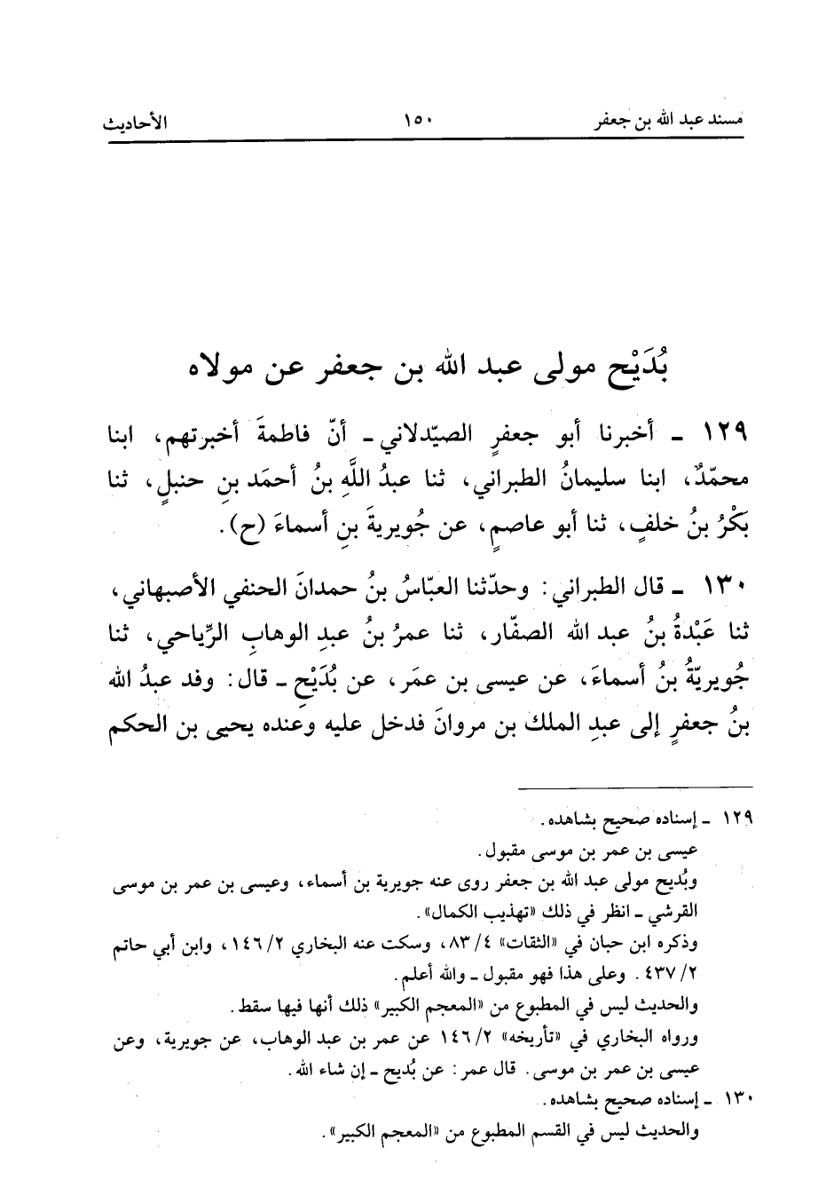 ١٣٠ - قَالَ الطَّبَرَانِيُّ: وَحَدَّثَنَا الْعَبَّاسُ بْنُ حَمْدَانَ الْحَنَفِيُّ الْأَصْبَهَانِيُّ، ثَنَا عَبْدَةُ بْنُ عَبْدِ اللهِ الصَّفَّارُ، ثَنَا عُمَرُ بْنُ عَبْدِ الْوَهَّابِ الرِّيَاحِيُّ، ثَنَا جُوَيْرِيَةُ بْنُ أَسْمَاءَ، عَنْ عِيسَى بْنِ عُمَرَ، عَنْ بُدَيْحٍ قَالَ: «وَفَدَ عَبْدُ اللهِ بْنُ جَعْفَرٍ إِلَى عَبْدِ الْمَلِكِ بْنِ مَرْوَانَ، فَدَخَلَ عَلَيْهِ وَعِنْدَهُ يَحْيَى بْنُ الْحَكَمِ