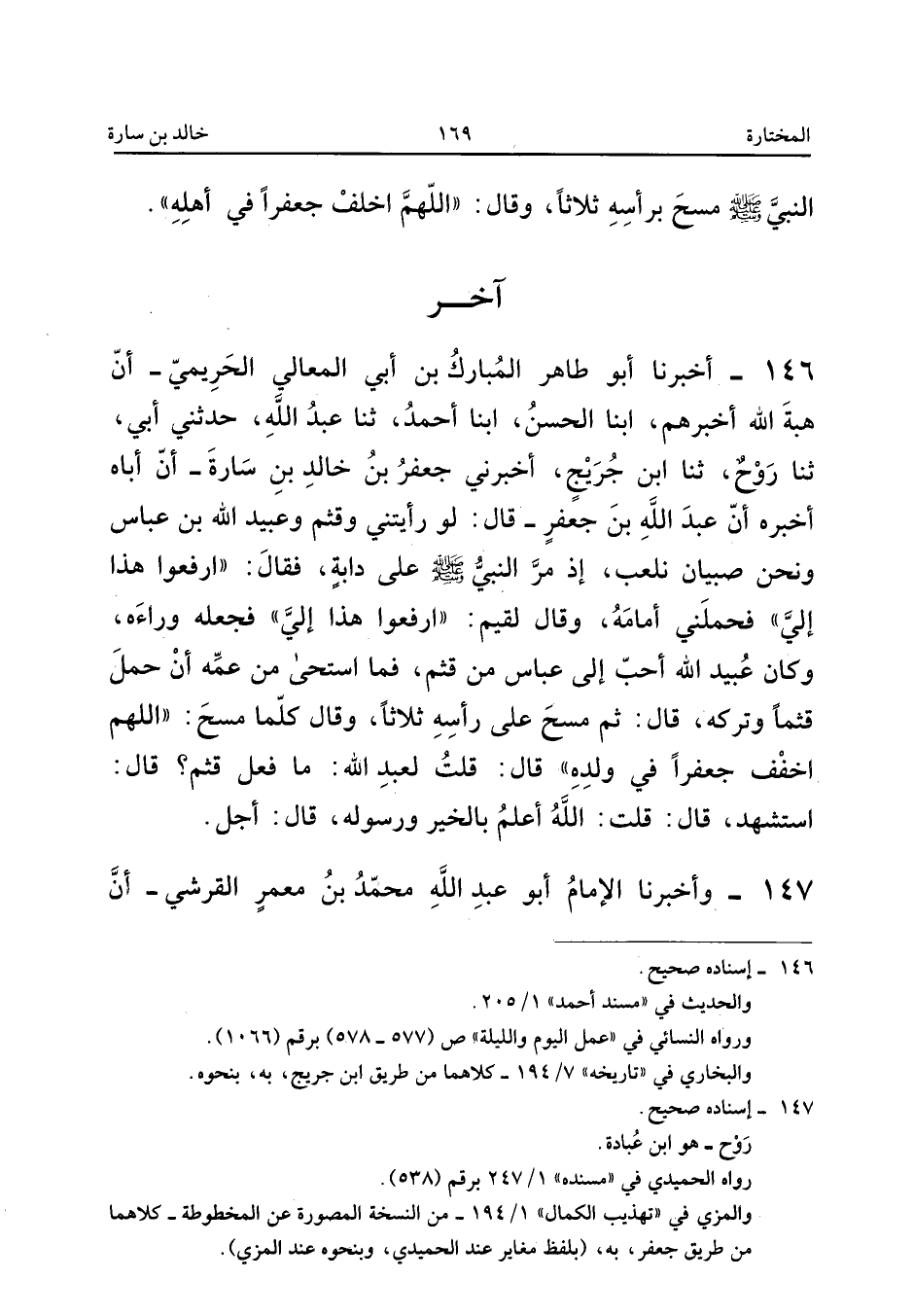 ١٤٦ - أَخْبَرَنَا أَبُو طَاهِرٍ الْمُبَارَكُ بْنُ أَبِي الْمَعَالِي الْحَرِيمِيُّ، أَنَّ هِبَةَ اللهِ أَخْبَرَهُمْ، أَبْنَا الْحَسَنُ، أَبْنَا أَحْمَدُ، ثَنَا عَبْدُ اللهِ، حَدَّثَنِي أَبِي، ثَنَا رَوْحٌ، ثَنَا ابْنُ جُرَيْجٍ، أَخْبَرَنِي جَعْفَرُ بْنُ خَالِدِ بْنِ سَارَةَ، أَنَّ أَبَاهُ أَخْبَرَهُ أَنَّ عَبْدَ اللهِ بْنَ جَعْفَرٍ قَالَ: «لَوْ رَأَيْتَنِي وَقُثَمَ وَعُبَيْدَ اللهِ بْنَ عَبَّاسٍ وَنَحْنُ صِبْيَانٌ نَلْعَبُ، إِذْ مَرَّ النَّبِيُّ صَلَّى اللهُ عَلَيْهِ وَسَلَّمَ عَلَى دَابَّةٍ، فَقَالَ: ارْفَعُوا هَذَا إِلَيَّ، فَحَمَلَنِي أَمَامَهُ، وَقَالَ لِقُثَمَ: ارْفَعُوا هَذَا إِلَيَّ، فَجَعَلَهُ وَرَاءَهُ، وَكَانَ عُبَيْدُ اللهِ أَحَبَّ إِلَى عَبَّاسٍ مِنْ قُثَمَ، فَمَا اسْتَحَى مِنْ عَمِّهِ أَنْ حَمَلَ قُثَمَ وَتَرَكَهُ، قَالَ: ثُمَّ مَسَحَ عَلَى رَأْسِهِ ثَلَاثًا وَقَالَ كُلَّمَا مَسَحَ: اللَّهُمَّ اخْلُفْ جَعْفَرًا فِي وَلَدِهِ، قَالَ: قُلْتُ لِعَبْدِ اللهِ: مَا فَعَلَ قُثَمُ؟ قَالَ: اسْتُشْهِدَ، قَالَ: قُلْتُ: اللهُ أَعْلَمُ بِالْخَيْرِ وَرَسُولُهُ، قَالَ: أَجَلْ».