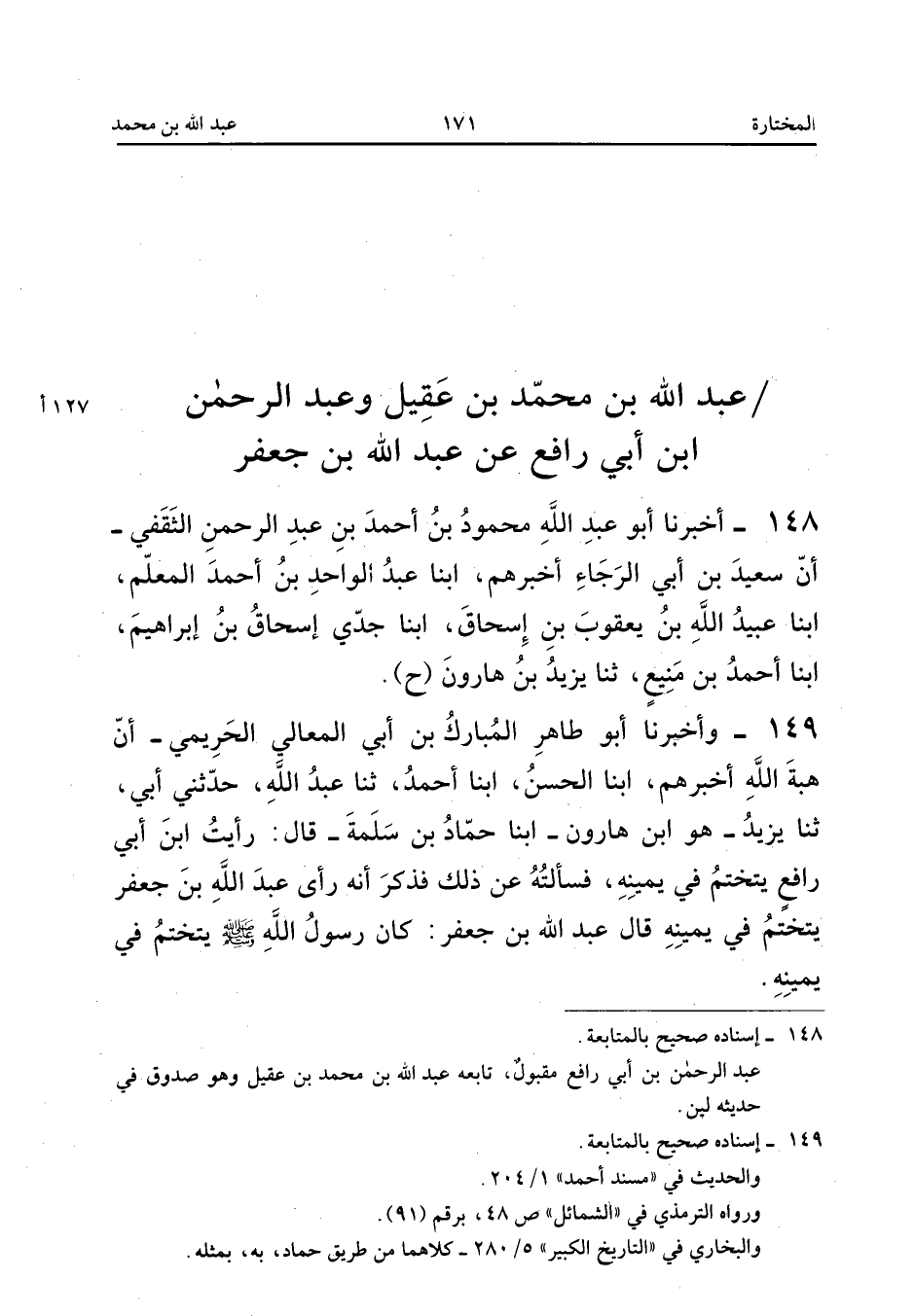 ١٤٩ - وَأَخْبَرَنَا أَبُو طَاهِرٍ الْمُبَارَكُ بْنُ أَبِي الْمَعَالِي الْحَرِيمِيُّ، أَنَّ هِبَةَ اللهِ أَخْبَرَهُمْ، أَبْنَا الْحَسَنُ، أَبْنَا أَحْمَدُ، ثَنَا عَبْدُ اللهِ، حَدَّثَنِي أَبِي، ثَنَا يَزِيدُ - هُوَ ابْنُ هَارُونَ - أَبْنَا حَمَّادُ بْنُ سَلَمَةَ، قَالَ: «رَأَيْتُ ابْنَ أَبِي رَافِعٍ يَتَخَتَّمُ فِي يَمِينِهِ، فَسَأَلْتُهُ عَنْ ذَلِكَ فَذَكَرَ أَنَّهُ رَأَى عَبْدَ اللهِ بْنَ جَعْفَرٍ يَتَخَتَّمُ فِي يَمِينِهِ، قَالَ عَبْدُ اللهِ بْنُ جَعْفَرٍ: كَانَ رَسُولُ اللهِ صَلَّى اللهُ عَلَيْهِ وَسَلَّمَ يَتَخَتَّمُ فِي يَمِينِهِ».