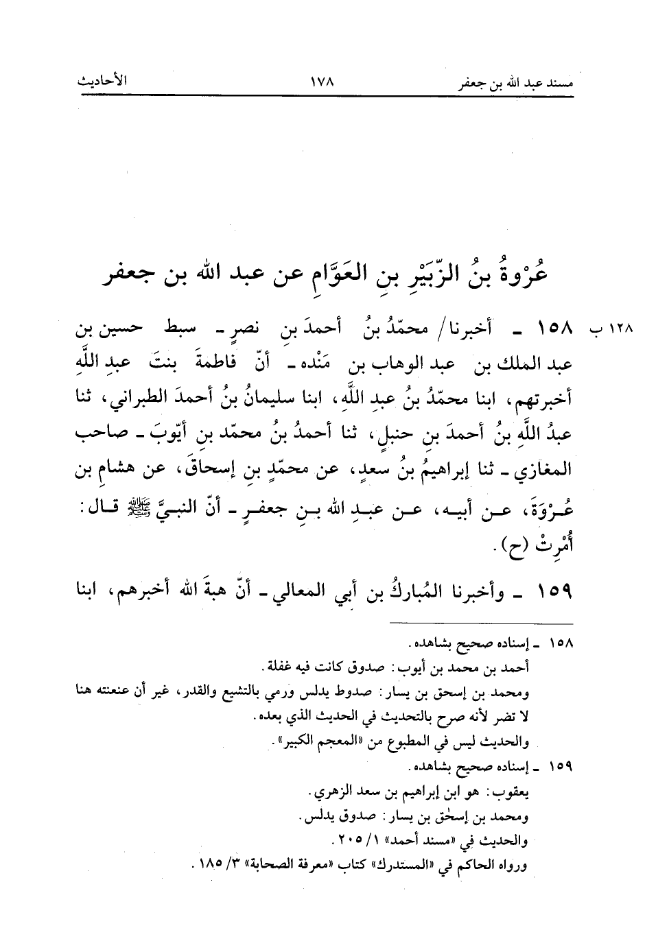 الْحَسَنُ، أَبْنَا أَحْمَدُ، ثَنَا عَبْدُ اللهِ، حَدَّثَنِي أَبِي، ثَنَا يَعْقُوبُ، ثَنَا أَبِي، عَنِ ابْنِ إِسْحَاقَ، قَالَ: فَحَدَّثَنِي هِشَامُ بْنُ عُرْوَةَ بْنِ الزُّبَيْرِ، عَنْ أَبِيهِ عُرْوَةَ، عَنْ عَبْدِ اللهِ بْنِ جَعْفَرِ بْنِ أَبِي طَالِبٍ، قَالَ: قَالَ رَسُولُ اللهِ صَلَّى اللهُ عَلَيْهِ وَسَلَّمَ: «أُمِرْتُ» (ح).