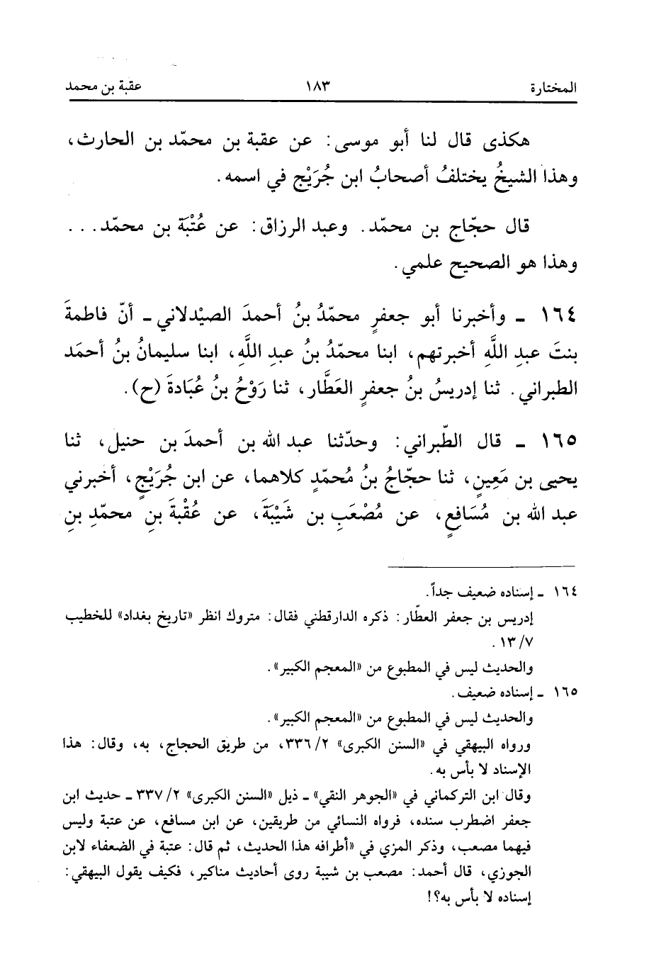 ١٦٥ - قَالَ الطَّبَرَانِيُّ: وَحَدَّثَنَا عَبْدُ اللهِ بْنُ أَحْمَدَ بْنِ حَنْبَلٍ، ثَنَا يَحْيَى بْنُ مَعِينٍ، ثَنَا حَجَّاجُ بْنُ مُحَمَّدٍ كِلَاهُمَا، عَنِ ابْنِ جُرَيْجٍ، أَخْبَرَنِي عَبْدُ اللهِ بْنُ مُسَافِعٍ، عَنْ مُصْعَبِ بْنِ شَيْبَةَ، عَنْ عُقْبَةَ بْنِ مُحَمَّدِ بْنِ