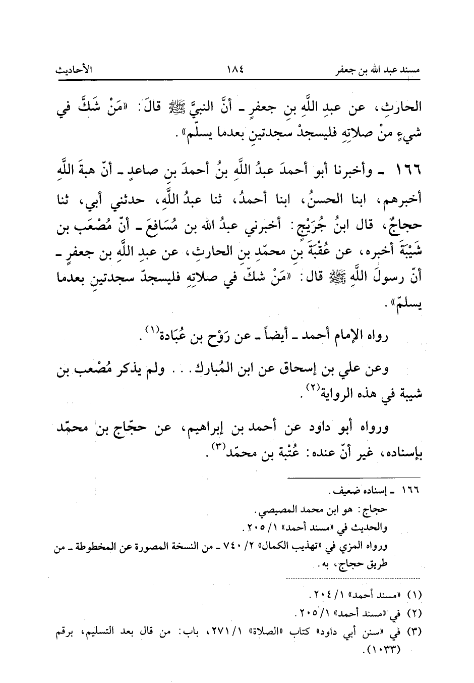 ١٦٦ - وَأَخْبَرَنَا أَبُو أَحْمَدَ عَبْدُ اللهِ بْنُ أَحْمَدَ بْنِ صَاعِدٍ، أَنَّ هِبَةَ اللهِ أَخْبَرَهُمْ، أَبْنَا الْحَسَنُ، أَبْنَا أَحْمَدُ، ثَنَا عَبْدُ اللهِ، حَدَّثَنِي أَبِي، ثَنَا حَجَّاجٌ، قَالَ ابْنُ جُرَيْجٍ: أَخْبَرَنِي عَبْدُ اللهِ بْنُ مُسَافِعٍ، أَنَّ مُصْعَبَ بْنَ شَيْبَةَ أَخْبَرَهُ عَنْ عُقْبَةَ بْنِ مُحَمَّدِ بْنِ الْحَارِثِ، عَنْ عَبْدِ اللهِ بْنِ جَعْفَرٍ، أَنَّ رَسُولَ اللهِ صَلَّى اللهُ عَلَيْهِ وَسَلَّمَ قَالَ: «مَنْ شَكَّ فِي صَلَاتِهِ فَلْيَسْجُدْ سَجْدَتَيْنِ بَعْدَمَا يُسَلِّمُ».