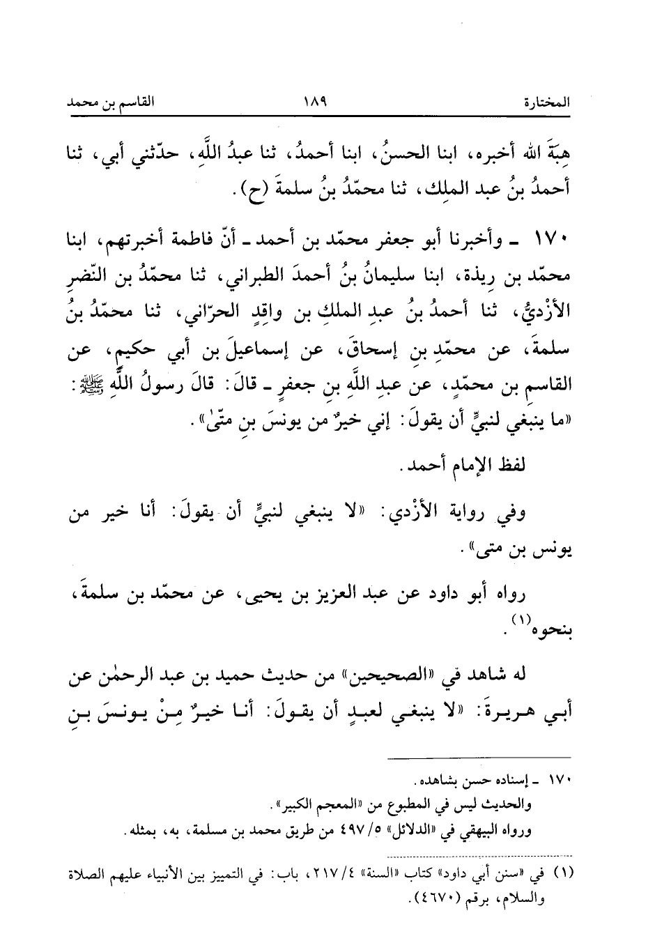١٧٠ - وَأَخْبَرَنَا أَبُو جَعْفَرٍ مُحَمَّدُ بْنُ أَحْمَدَ: أَنَّ فَاطِمَةَ أَخْبَرَتْهُمْ، أَبْنَا مُحَمَّدُ بْنُ رِيذَةَ، أَبْنَا سُلَيْمَانُ بْنُ أَحْمَدَ الطَّبَرَانِيُّ، ثَنَا مُحَمَّدُ بْنُ النَّضِرِ الْأَزْدِيُّ، ثَنَا أَحْمَدُ بْنُ عَبْدِ الْمَلِكِ بْنِ وَاقِدٍ الْحَرَّانِيُّ، ثَنَا مُحَمَّدُ بْنُ سَلَمَةَ، عَنْ مُحَمَّدِ بْنِ إِسْحَاقَ، عَنْ إِسْمَاعِيلَ بْنِ أَبِي حَكِيمٍ، عَنِ الْقَاسِمِ بْنِ مُحَمَّدٍ، عَنْ عَبْدِ اللهِ بْنِ جَعْفَرٍ قَالَ: قَالَ رَسُولُ اللهِ صَلَّى اللهُ عَلَيْهِ وَسَلَّمَ: «مَا يَنْبَغِي لِنَبِيٍّ أَنْ يَقُولَ: إِنِّي خَيْرٌ مِنْ يُونُسَ بْنِ مَتَّى.