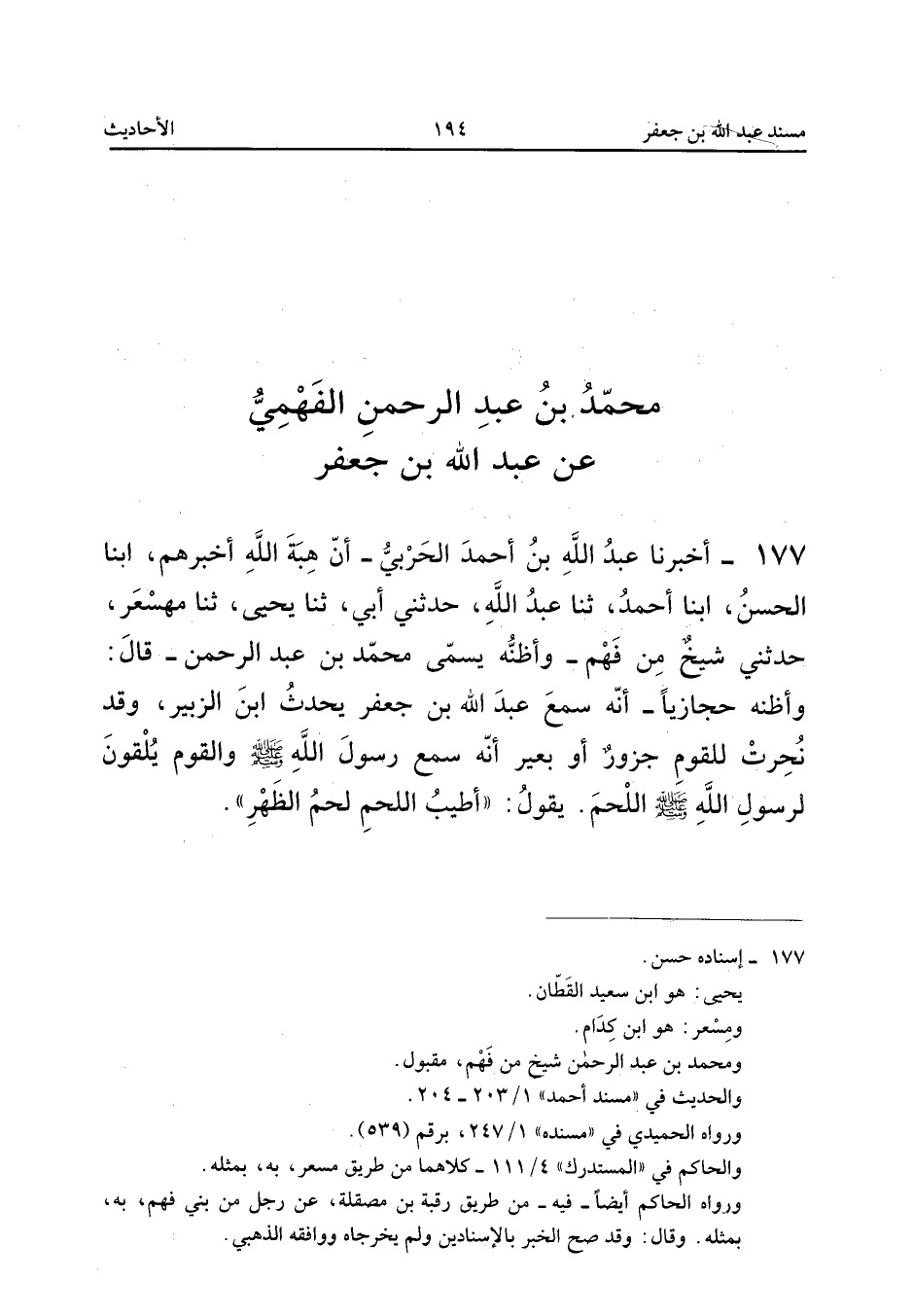 ١٧٧ - أَخْبَرَنَا عَبْدُ اللهِ بْنُ أَحْمَدَ الْحَرْبِيُّ، أَنَّ هِبَةَ اللهِ أَخْبَرَهُمْ، أَبْنَا الْحَسَنُ، أَبْنَا أَحْمَدُ، ثَنَا عَبْدُ اللهِ حَدَّثَنِي أَبِي، ثَنَا يَحْيَى، ثَنَا مِسْعَرٌ، حَدَّثَنِي شَيْخٌ مِنْ فَهْمٍ - وَأَظُنُّهُ يُسَمَّى مُحَمَّدَ بْنَ عَبْدِ الرَّحْمَنِ - قَالَ: وَأَظُنُّهُ حِجَازِيًّا، «أَنَّهُ سَمِعَ عَبْدَ اللهِ بْنَ جَعْفَرٍ يُحَدِّثُ ابْنَ الزُّبَيْرِ، وَقَدْ نُحِرَتْ لِلْقَوْمِ جَزُورٌ أَوْ بَعِيرٌ، أَنَّهُ سَمِعَ رَسُولَ اللهِ صَلَّى اللهُ عَلَيْهِ وَسَلَّمَ وَالْقَوْمُ يُلْقُونَ لِرَسُولِ اللهِ صَلَّى اللهُ عَلَيْهِ وَسَلَّمَ اللَّحْمَ يَقُولُ: أَطْيَبُ اللَّحْمِ لَحْمُ الظَّهْرِ».