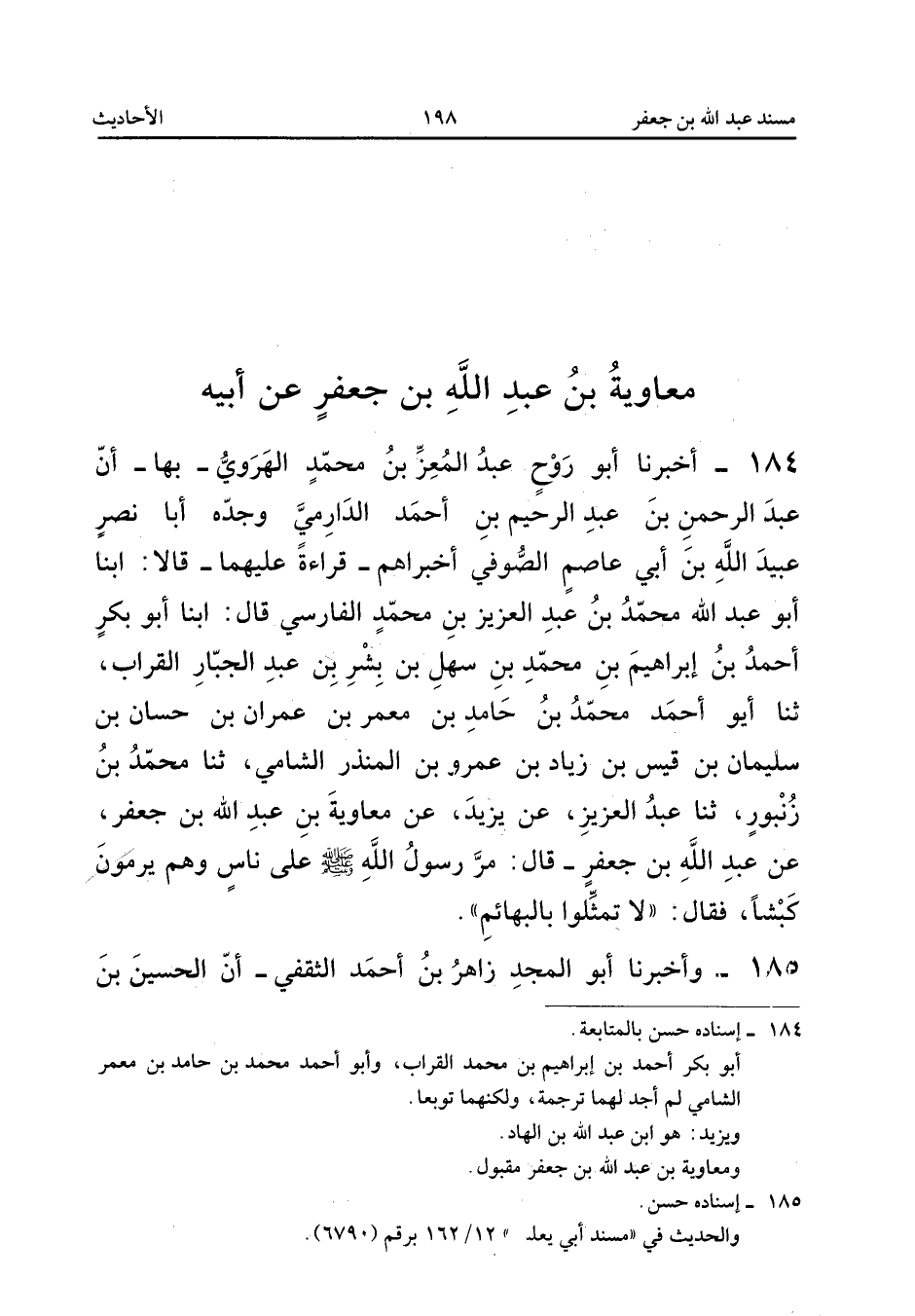 ١٨٤ - أَخْبَرَنَا أَبُو رَوْحٍ عَبْدُ الْمُعِزِّ بْنُ مُحَمَّدٍ الْهَرَوِيُّ - بِهَا - أَنَّ عَبْدَ الرَّحْمَنِ بْنَ عَبْدِ الرَّحِيمِ بْنِ أَحْمَدَ الدَّارِمِيَّ وَجَدَّهُ أَبَا نَصْرٍ عُبَيْدَ اللهِ بْنَ أَبِي عَاصِمٍ الصُّوفِيَّ أَخْبَرَاهُمْ - قِرَاءَةً عَلَيْهِمَا - قَالَا: أَبْنَا أَبُو عَبْدِ اللهِ مُحَمَّدُ بْنُ عَبْدِ الْعَزِيزِ بْنِ مُحَمَّدِ الْفَارِسِيُّ قَالَ: أَبْنَا أَبُو بَكْرٍ أَحْمَدُ بْنُ إِبْرَاهِيمَ بْنِ مُحَمَّدِ بْنِ سَهْلِ بْنِ بِشْرِ بْنِ عَبْدِ الْجَبَّارِ الْقَرَّابُّ، ثَنَا أَبُو أَحْمَدَ مُحَمَّدُ بْنُ حَامِدِ بْنِ مَعْمَرِ بْنِ عِمْرَانَ بْنِ حَسَّانَ بْنِ سُلَيْمَانَ بْنِ قَيْسِ بْنِ زِيَادِ بْنِ عَمْرِو بْنِ الْمُنْذِرِ الشَّامِيُّ، ثَنَا مُحَمَّدُ بْنُ زُنْبُورٍ، ثَنَا عَبْدُ الْعَزِيزِ، عَنْ يَزِيدَ، عَنْ مُعَاوِيَةَ بْنِ عَبْدِ اللهِ بْنِ جَعْفَرٍ، عَنْ عَبْدِ اللهِ بْنِ جَعْفَرٍ قَالَ: «مَرَّ رَسُولُ اللهِ صَلَّى اللهُ عَلَيْهِ وَسَلَّمَ عَلَى نَاسٍ وَهُمْ يَرْمُونَ كَبْشًا، فَقَالَ: لَا تُمَثِّلُوا بِالْبَهَائِمِ».