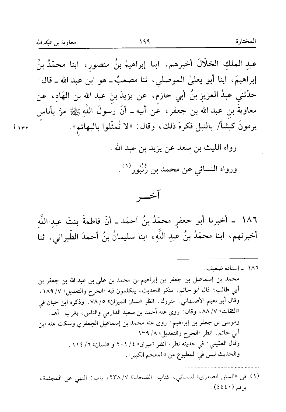 ١٨٦ - أَخْبَرَنَا أَبُو جَعْفَرٍ مُحَمَّدُ بْنُ أَحْمَدَ، أَنَّ فَاطِمَةَ بِنْتَ عَبْدِ اللهِ أَخْبَرَتْهُمْ، أَبْنَا مُحَمَّدُ بْنُ عَبْدِ اللهِ، أَبْنَا سُلَيْمَانُ بْنُ أَحْمَدَ الطَّبَرَانِيُّ، ثَنَا