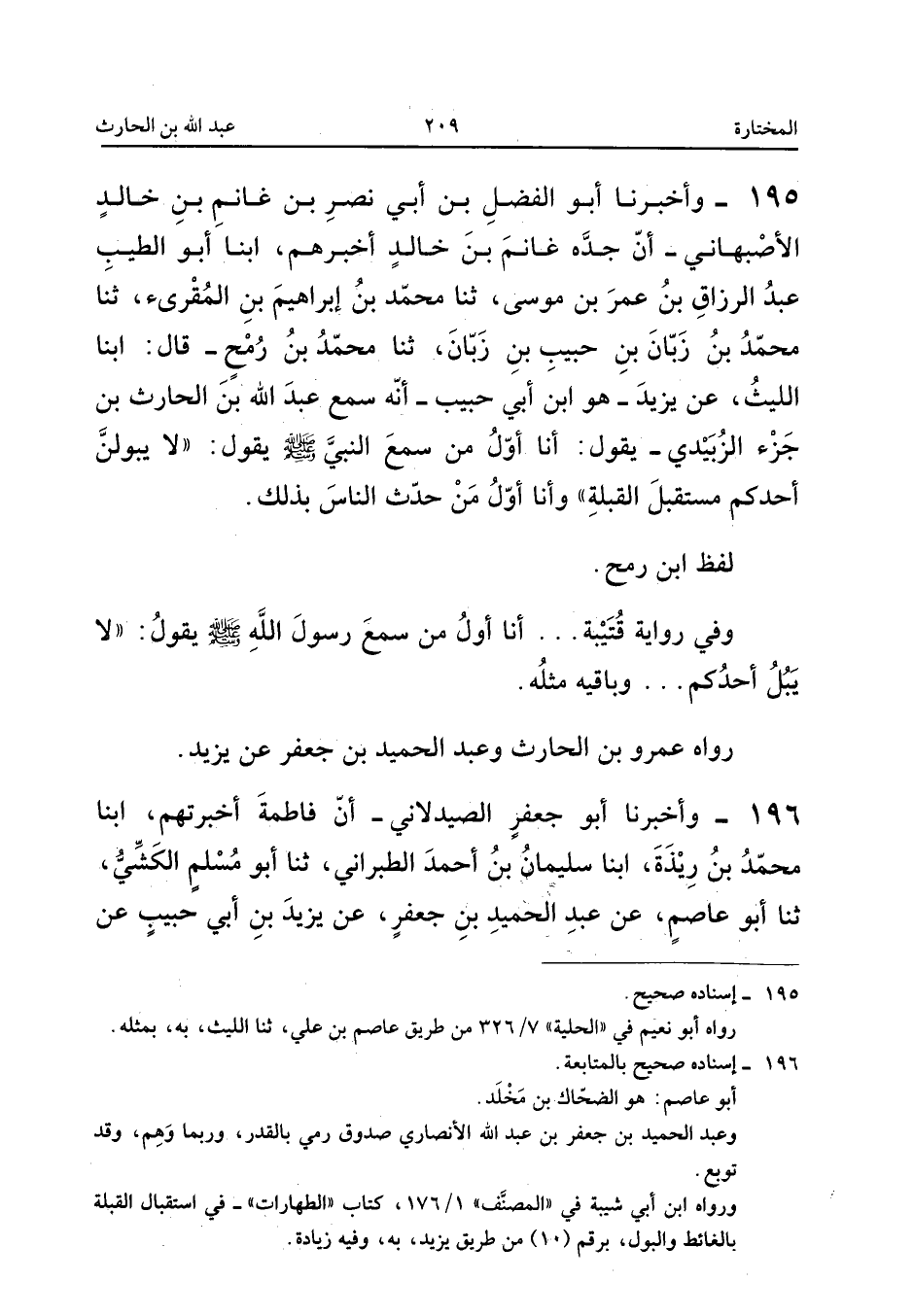 عَبْدِ اللهِ بْنِ الْحَارِثِ قَالَ: «أَنَا أَوَّلُ مَنْ سَمِعَ النَّبِيَّ صَلَّى اللهُ عَلَيْهِ وَسَلَّمَ يَنْهَى عَنِ الْبَوْلِ مُسْتَقْبِلَ الْقِبْلَةِ».