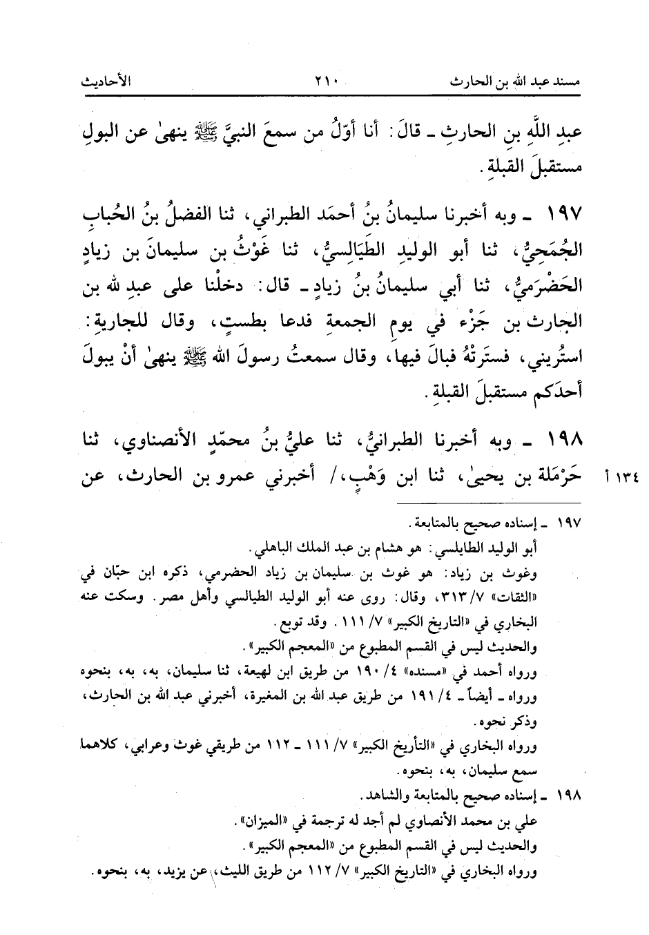 ١٩٧ - وَبِهِ أَخْبَرَنَا سُلَيْمَانُ بْنُ أَحْمَدَ الطَّبَرَانِيُّ، ثَنَا الْفَضْلُ بْنُ الْحُبَابِ الْجُمَحِيُّ، ثَنَا أَبُو الْوَلِيدِ الطَّيَالِسِيُّ، ثَنَا غَوْثُ بْنُ سُلَيْمَانَ بْنِ زِيَادٍ الْحَضْرَمِيُّ، ثَنَا أَبِي سُلَيْمَانُ بْنُ زِيَادٍ قَالَ: «دَخَلْنَا عَلَى عَبْدِ اللهِ بْنِ الْحَارِثِ بْنِ جَزْءٍ فِي يَوْمِ الْجُمُعَةِ فَدَعَا بِطَسْتٍ، وَقَالَ لِلْجَارِيَةِ: اسْتُرِينِي، فَسَتَرَتْهُ فَبَالَ فِيهَا، وَقَالَ: سَمِعْتُ رَسُولَ اللهِ صَلَّى اللهُ عَلَيْهِ وَسَلَّمَ يَنْهَى أَنْ يَبُولَ أَحَدُكُمْ مُسْتَقْبِلَ الْقِبْلَةِ».