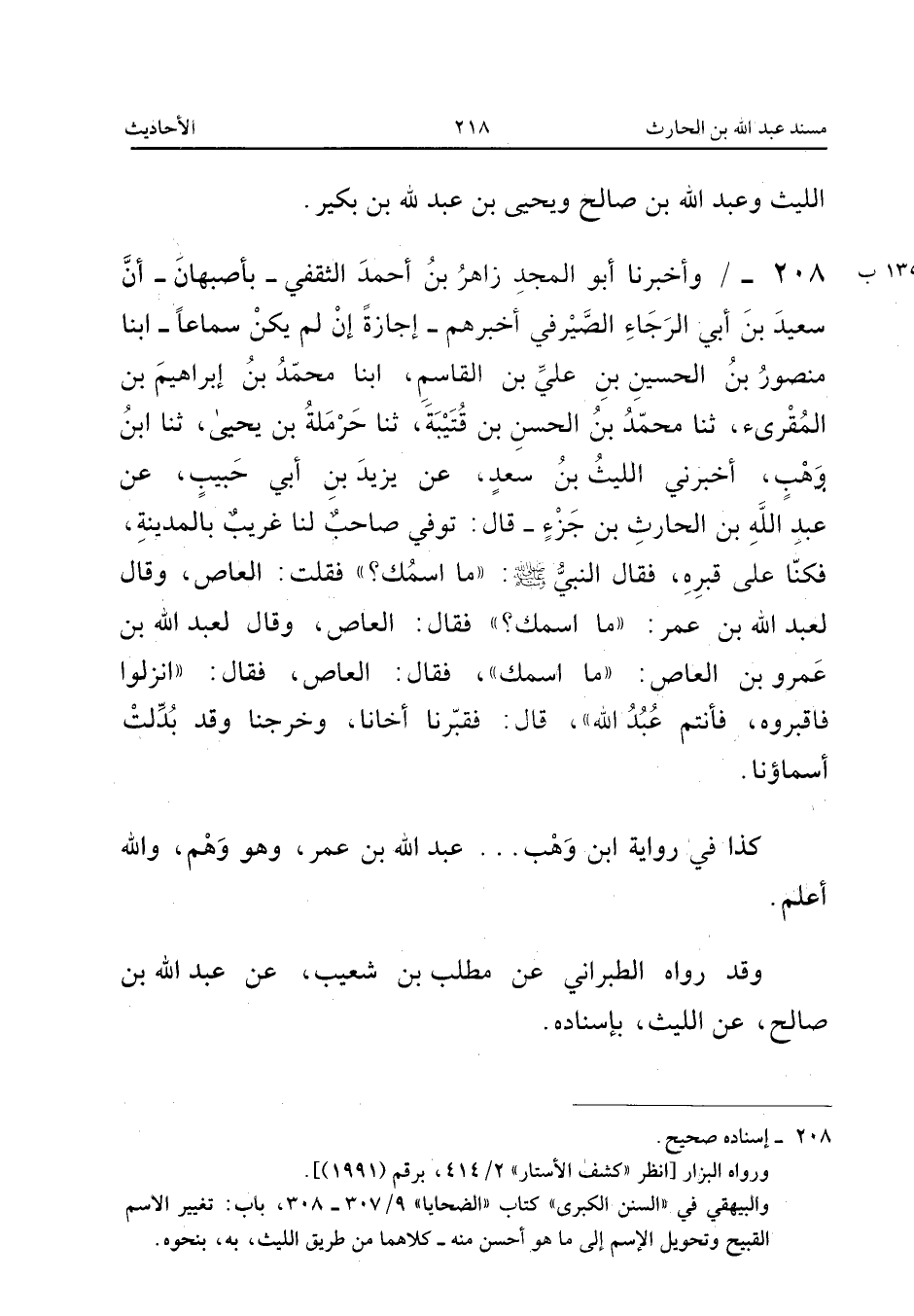 ٢٠٨ - وَأَخْبَرَنَا أَبُو الْمَجْدِ زَاهِرُ بْنُ أَحْمَدَ الثَّقَفِيُّ - بِأَصْبَهَانَ - أَنَّ سَعِيدَ بْنَ أَبِي الرَّجَاءِ الصَّيْرَفِيَّ أَخْبَرَهُمْ - إِجَازَةً إِنْ لَمْ يَكُنْ سَمَاعًا - أَبْنَا مَنْصُورُ بْنُ الْحُسَيْنِ بْنِ عَلِيِّ بْنِ الْقَاسِمِ، أَبْنَا مُحَمَّدُ بْنُ إِبْرَاهِيمَ بْنِ الْمُقْرِئِ، ثَنَا مُحَمَّدُ بْنُ الْحَسَنِ بْنِ قُتَيْبَةَ، ثَنَا حَرْمَلَةُ بْنُ يَحْيَى، ثَنَا ابْنُ وَهْبٍ، أَخْبَرَنِي اللَّيْثُ بْنُ سَعْدٍ، عَنْ يَزِيدَ بْنِ أَبِي حَبِيبٍ، عَنْ عَبْدِ اللهِ بْنِ الْحَارِثِ بْنِ جَزْءٍ قَالَ: «تُوُفِّيَ صَاحِبٌ لَنَا غَرِيبٌ بِالْمَدِينَةِ، فَكُنَّا عَلَى قَبْرِهِ، فَقَالَ النَّبِيُّ صَلَّى اللهُ عَلَيْهِ وَسَلَّمَ: مَا اسْمُكَ؟ فَقُلْتُ: الْعَاصِ، وَقَالَ لِعَبْدِ اللهِ بْنِ عُمَرَ: مَا اسْمُكَ؟ فَقَالَ: الْعَاصِ، وَقَالَ لِعَبْدِ اللهِ بْنِ عَمْرِو بْنِ الْعَاصِ: مَا اسْمُكَ؟ فَقَالَ: الْعَاصِ، فَقَالَ: انْزِلُوا فَأَقْبِرُوهُ فَأَنْتُمْ عَبْدُ اللهِ، قَالَ: فَقَبَرْنَا أَخَانَا، وَخَرَجْنَا وَقَدْ بُدِّلَتْ أَسْمَاؤُنَا».