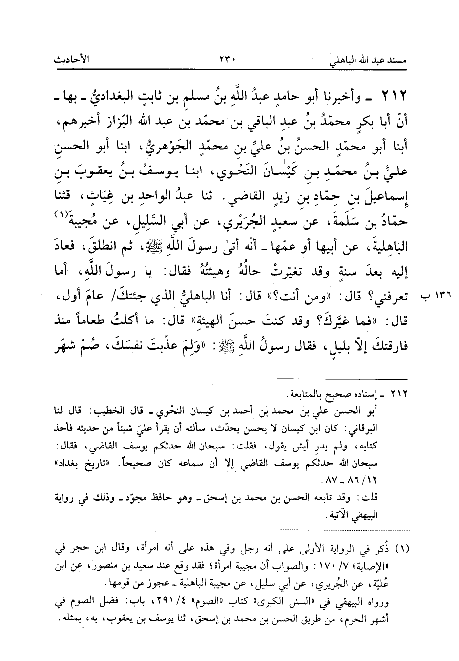 ٢١٢ - وَأَخْبَرَنَا أَبُو حَامِدٍ عَبْدُ اللهِ بْنُ مُسْلِمِ بْنِ ثَابِتٍ الْبَغْدَادِيُّ - بِهَا - أَنَّ أَبَا بَكْرٍ مُحَمَّدَ بْنَ عَبْدِ الْبَاقِي بْنِ مُحَمَّدِ بْنِ عَبْدِ اللهِ الْبَزَّازَ أَخْبَرَهُمْ، أَبْنَا أَبُو مُحَمَّدٍ الْحَسَنُ بْنُ عَلِيِّ بْنِ مُحَمَّدٍ الْجَوْهَرِيُّ، أَبْنَا أَبُو الْحَسَنِ عَلِيُّ بْنُ مُحَمَّدِ بْنِ كَيْسَانَ النَّحْوِيُّ، أَبْنَا يُوسُفُ بْنُ يَعْقُوبَ بْنِ إِسْمَاعِيلَ بْنِ حَمَّادِ بْنِ زَيْدٍ الْقَاضِي، ثَنَا عَبْدُ الْوَاحِدِ بْنُ غِيَاثٍ قَثَنَا حَمَّادُ بْنُ سَلَمَةَ، عَنْ سَعِيدٍ الْجُرَيْرِيِّ، عَنْ أَبِي السَّلِيلِ، عَنْ مُجِيبَةَ الْبَاهِلِيَّةِ، عَنْ أَبِيهَا أَوْ عَمِّهَا: «أَنَّهُ أَتَى رَسُولَ اللهِ صَلَّى اللهُ عَلَيْهِ وَسَلَّمَ ثُمَّ انْطَلَقَ، فَعَادَ إِلَيْهِ بَعْدَ سَنَةٍ وَقَدْ تَغَيَّرَتْ حَالُهُ وَهَيْئَتُهُ، فَقَالَ: يَا رَسُولَ اللهِ أَمَا تَعْرِفُنِي؟ قَالَ: وَمَنْ أَنْتَ؟ قَالَ: أَنَا الْبَاهِلِيُّ الَّذِي جِئْتُكَ عَامَ أَوَّلَ، قَالَ: فَمَا غَيَّرَكَ وَقَدْ كُنْتَ حَسَنَ الْهَيْئَةِ؟ قَالَ: مَا أَكَلْتُ طَعَامًا مُنْذُ فَارَقْتُكَ إِلَّا بِلَيْلٍ، فَقَالَ رَسُولُ اللهِ صَلَّى اللهُ عَلَيْهِ وَسَلَّمَ: وَلِمَ عَذَّبْتَ نَفْسَكَ؟ صُمْ شَهْرَ