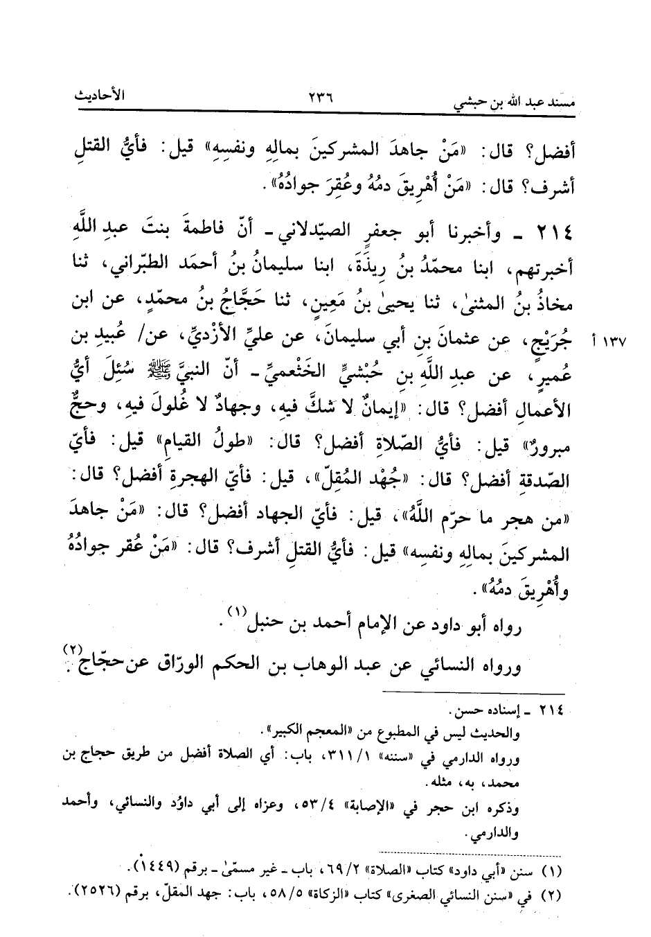 ٢١٤ - وَأَخْبَرَنَا أَبُو جَعْفَرٍ الصَّيْدَلَانِيُّ، أَنَّ فَاطِمَةَ بِنْتَ عَبْدِ اللهِ أَخْبَرَتْهُمْ، أَبْنَا مُحَمَّدُ بْنُ رِيذَةَ، أَبْنَا سُلَيْمَانُ بْنُ أَحْمَدَ الطَّبَرَانِيُّ، ثَنَا مُعَاذُ بْنُ الْمُثَنَّى، ثَنَا يَحْيَى بْنُ مَعِينٍ، ثَنَا حَجَّاجُ بْنُ مُحَمَّدٍ، عَنِ ابْنِ جُرَيْجٍ، عَنْ عُثْمَانَ بْنِ أَبِي سُلَيْمَانَ، عَنْ عَلِيٍّ الْأَزْدِيِّ، عَنْ عُبَيْدِ بْنِ عُمَيْرٍ، عَنْ عَبْدِ اللهِ بْنِ حُبْشِيٍّ الْخَثْعَمِيِّ: «أَنَّ النَّبِيَّ صَلَّى اللهُ عَلَيْهِ وَسَلَّمَ سُئِلَ: أَيُّ الْأَعْمَالِ أَفْضَلُ؟ قَالَ: إِيمَانٌ لَا شَكَّ فِيهِ، وَجِهَادٌ لَا غُلُولَ فِيهِ، وَحَجٌّ مَبْرُورٌ، قِيلَ: فَأَيُّ الصَّلَاةِ أَفْضَلُ؟ قَالَ: طُولُ الْقِيَامِ، قِيلَ: فَأَيُّ الصَّدَقَةِ أَفْضَلُ؟ قَالَ: جُهْدُ الْمُقِلِّ، قِيلَ: فَأَيُّ الْهِجْرَةِ أَفْضَلُ؟ قَالَ: مَنْ هَجَرَ مَا حَرَّمَ اللهُ، قِيلَ: فَأَيُّ الْجِهَادِ أَفْضَلُ؟ قَالَ: مَنْ جَاهَدَ الْمُشْرِكِينَ بِمَالِهِ وَنَفْسِهِ، قِيلَ: فَأَيُّ الْقَتْلِ أَشْرَفُ؟ قَالَ: مَنْ عُقِرَ جَوَادُهُ وَأُهْرِيقَ دَمُهُ».