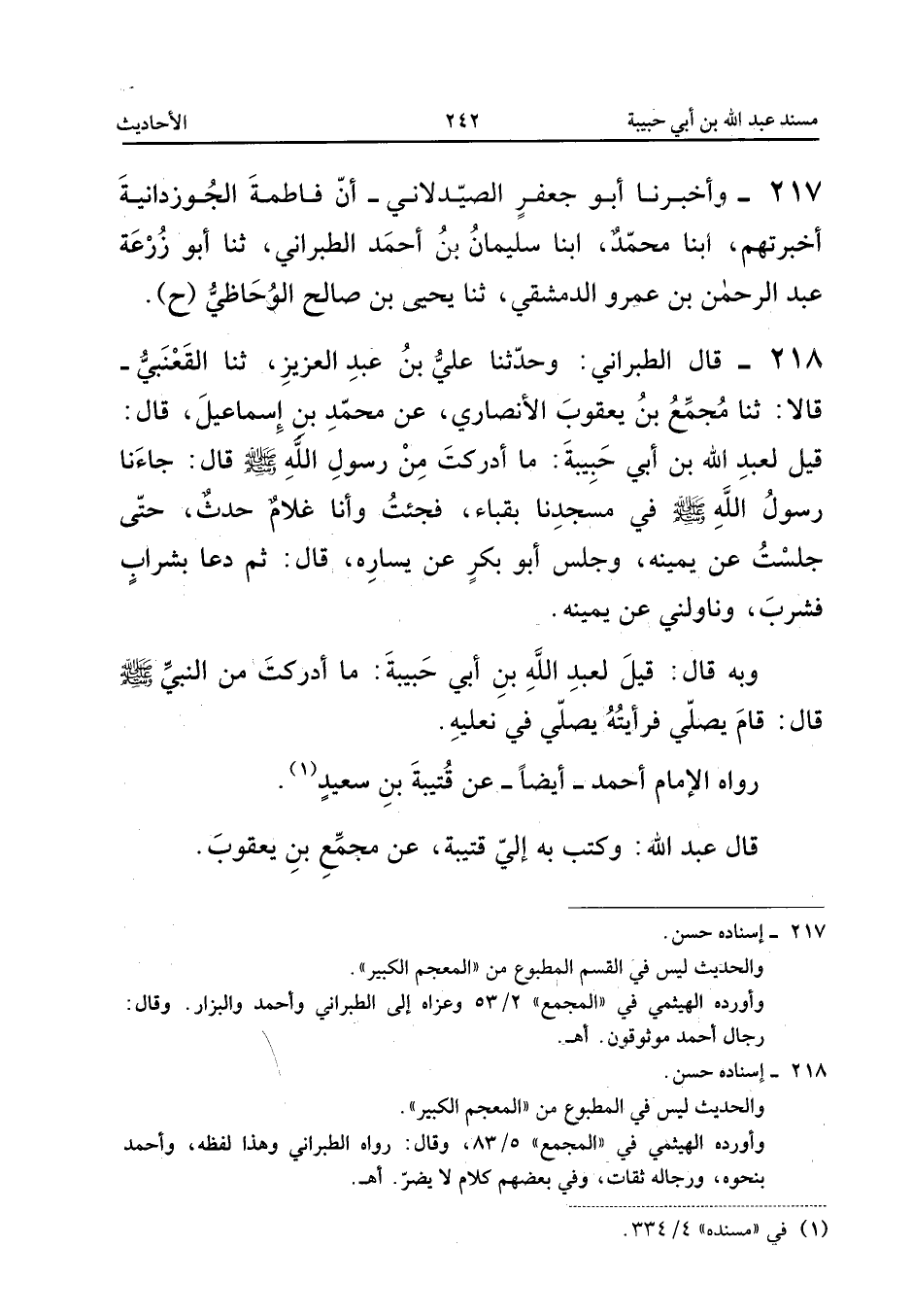 ٢١٨ - قَالَ الطَّبَرَانِيُّ: وَحَدَّثَنَا عَلِيُّ بْنُ عَبْدِ الْعَزِيزِ، ثَنَا الْقَعْنَبِيُّ، قَالَا: ثَنَا مُجَمِّعُ بْنُ يَعْقُوبَ الْأَنْصَارِيُّ، عَنْ مُحَمَّدِ بْنِ إِسْمَاعِيلَ قَالَ: قِيلَ لِعَبْدِ اللهِ بْنِ أَبِي حَبِيبَةَ: «مَا أَدْرَكْتَ مِنْ رَسُولِ اللهِ صَلَّى اللهُ عَلَيْهِ وَسَلَّمَ؟ قَالَ: جَاءَنَا رَسُولُ اللهِ صَلَّى اللهُ عَلَيْهِ وَسَلَّمَ فِي مَسْجِدِنَا بِقُبَاءَ، فَجِئْتُ وَأَنَا غُلَامٌ حَدَثٌ حَتَّى جَلَسْتُ عَنْ يَمِينِهِ، وَجَلَسَ أَبُو بَكْرٍ عَنْ يَسَارِهِ، قَالَ: ثُمَّ دَعَا بِشَرَابٍ فَشَرِبَ وَنَاوَلَنِي عَنْ يَمِينِهِ».