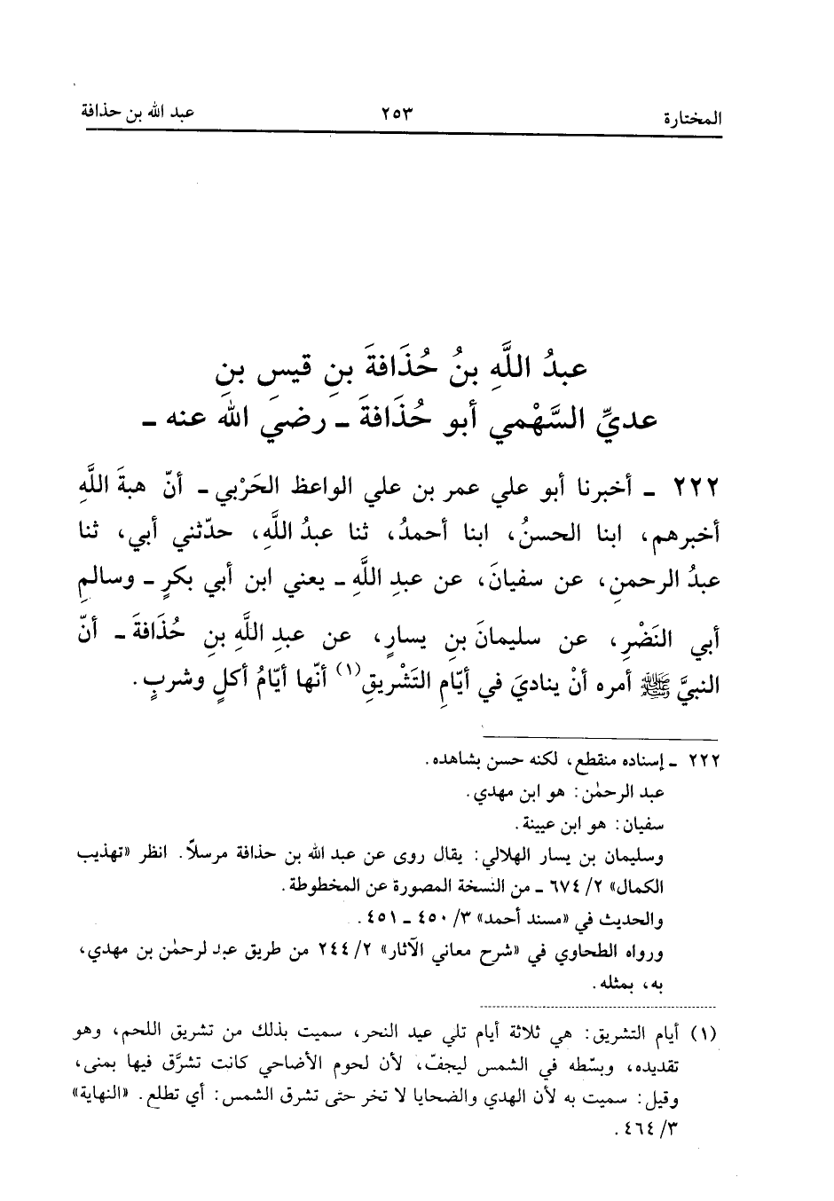 ٢٢٢ - أَخْبَرَنَا أَبُو عَلِيٍّ عُمَرُ بْنُ عَلِيٍّ الْوَاعِظُ الْحَرْبِيُّ، أَنَّ هِبَةَ اللهِ أَخْبَرَهُمْ، أَبْنَا الْحَسَنُ، أَبْنَا أَحْمَدُ، ثَنَا عَبْدُ اللهِ، حَدَّثَنِي أَبِي، ثَنَا عَبْدُ الرَّحْمَنِ، عَنْ سُفْيَانَ، عَنْ عَبْدِ اللهِ - يَعْنِي ابْنَ أَبِي بَكْرٍ - وَسَالِمٍ أَبِي النَّضْرِ، عَنْ سُلَيْمَانَ بْنِ يَسَارٍ، عَنْ عَبْدِ اللهِ بْنِ حُذَافَةَ: «أَنَّ النَّبِيَّ صَلَّى اللهُ عَلَيْهِ وَسَلَّمَ أَمَرَهُ أَنْ يُنَادِيَ فِي أَيَّامِ التَّشْرِيقِ أَنَّهَا أَيَّامُ أَكْلٍ وَشُرْبٍ».