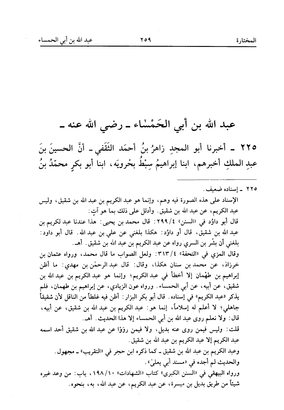 إِبْرَاهِيمَ، أَبْنَا أَبُو يَعْلَى أَحْمَدُ بْنُ عَلِيٍّ الْمَوْصِلِيُّ، ثَنَا إِبْرَاهِيمُ بْنُ مُحَمَّدِ بْنِ عَرْعَرَةَ، ثَنَا مُعَاذُ بْنُ هَانِي، ثَنَا إِبْرَاهِيمُ بْنُ طَهْمَانَ، ثَنَا بُدَيْلُ بْنُ مَيْسَرَةَ، عَنْ عَبْدِ الْكَرِيمِ، عَنْ عَبْدِ اللهِ بْنِ شَقِيقٍ، عَنْ أَبِيهِ، عَنْ عَبْدِ اللهِ بْنِ أَبِي الْحَمْسَاءِ قَالَ: «بَايَعْتُ النَّبِيَّ صَلَّى اللهُ عَلَيْهِ وَسَلَّمَ قَبْلَ أَنْ يُبْعَثَ، فَبَقِيَ لَهُ عَلَيَّ شَيْءٌ فَوَعَدْتُهُ أَنْ آتِيَهُ مَكَانَهُ فَنَسِيتُ أَنْ آتِيَهُ يَوْمَهُ ذَلِكَ وَمِنَ الْغَدِ، فَأَتَيْتُهُ الْيَوْمَ الثَّالِثَ فَوَجَدْتُهُ فِي مَكَانِهِ ذَلِكَ، فَقَالَ لِي: لَقَدْ شَقَقْتَ عَلَيَّ، أَنَا هَهُنَا مُنْذُ ثَلَاثَةِ أَيَّامٍ».