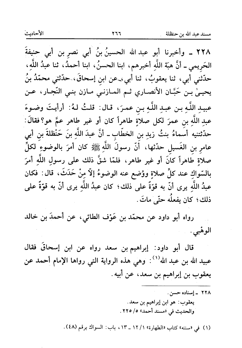 ٢٢٨ - وَأَخْبَرَنَا أَبُو عَبْدِ اللهِ الْحُسَيْنُ بْنُ أَبِي نَصْرِ بْنِ أَبِي حَنِيفَةَ الْحَرِيمِيُّ، أَنَّ هِبَةَ اللهِ أَخْبَرَهُمْ، أَبْنَا الْحَسَنُ، أَبْنَا أَحْمَدُ، ثَنَا عَبْدُ اللهِ، حَدَّثَنِي أَبِي، ثَنَا يَعْقُوبُ، ثَنَا أَبِي، عَنِ ابْنِ إِسْحَاقَ، حَدَّثَنِي مُحَمَّدُ بْنُ يَحْيَى بْنِ حَبَّانَ الْأَنْصَارِيُّ ثُمَّ الْمَازِنِيُّ، مَازِنُ بَنِي النَّجَّارِ، عَنْ عُبَيْدِ اللهِ بْنِ عَبْدِ اللهِ بْنِ عُمَرَ قَالَ: قُلْتُ لَهُ: «أَرَأَيْتَ وُضُوءَ عَبْدِ اللهِ بْنِ عُمَرَ لِكُلِّ صَلَاةٍ طَاهِرًا كَانَ أَوْ غَيْرَ طَاهِرٍ، عَمَّ هُوَ؟ فَقَالَ: حَدَّثَتْنِيهِ أَسْمَاءُ بِنْتُ زَيْدِ بْنِ الْخَطَّابِ: أَنَّ عَبْدَ اللهِ بْنَ حَنْظَلَةَ بْنِ أَبِي عَامِرِ بْنِ الْغَسِيلِ حَدَّثَهَا: أَنَّ رَسُولَ اللهِ صَلَّى اللهُ عَلَيْهِ وَسَلَّمَ كَانَ أُمِرَ بِالْوُضُوءِ لِكُلِّ صَلَاةٍ طَاهِرًا كَانَ أَوْ غَيْرَ طَاهِرٍ، فَلَمَّا شَقَّ ذَلِكَ عَلَى رَسُولِ اللهِ أَمَرَ بِالسِّوَاكِ عِنْدَ كُلِّ صَلَاةٍ وَوُضِعَ عَنْهُ الْوُضُوءُ إِلَّا مِنْ حَدَثٍ، قَالَ: فَكَانَ عَبْدُ اللهِ يَرَى أَنَّ بِهِ قُوَّةً عَلَى ذَلِكَ، كَانَ يَفْعَلُهُ حَتَّى مَاتَ».