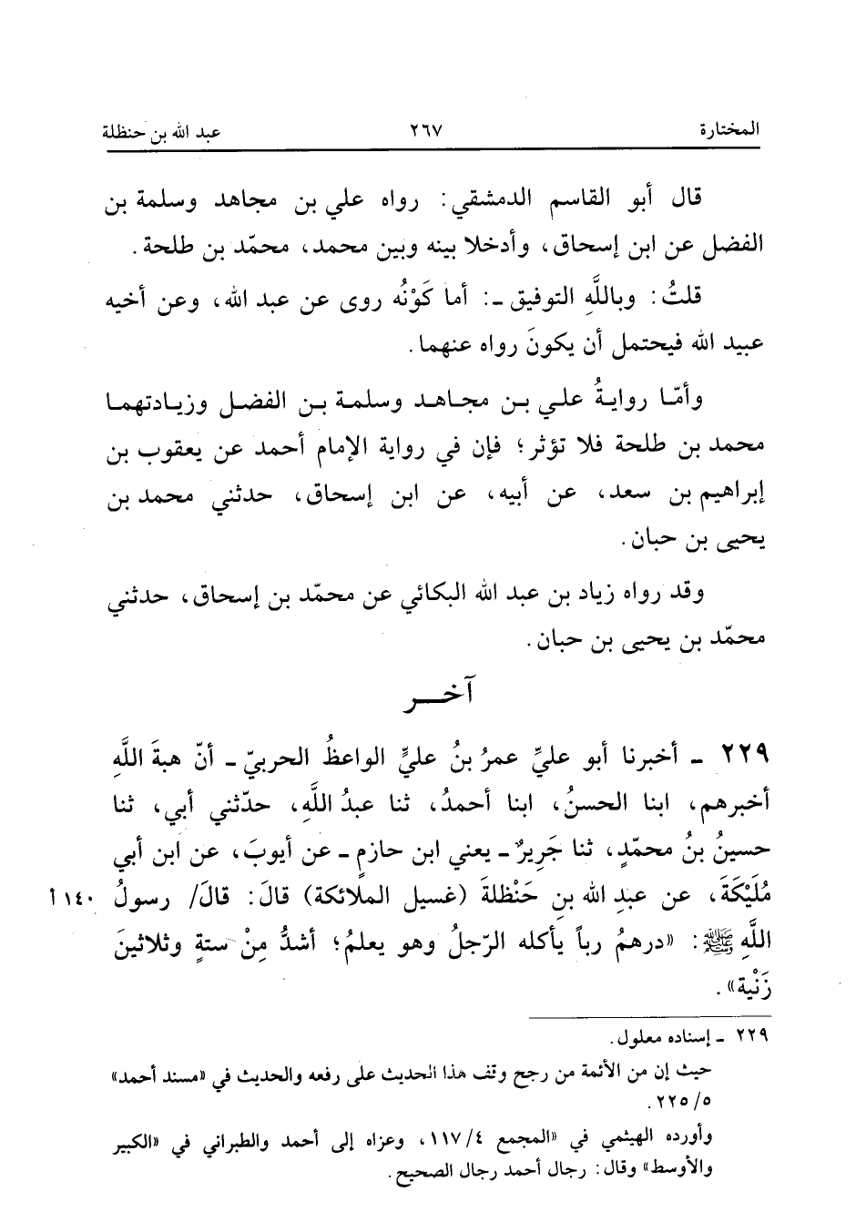 ٢٢٩ - أَخْبَرَنَا أَبُو عَلِيٍّ عُمَرُ بْنُ عَلِيٍّ الْوَاعِظُ الْحَرْبِيُّ، أَنَّ هِبَةَ اللهِ أَخْبَرَهُمْ، أَبْنَا الْحَسَنُ، أَبْنَا أَحْمَدُ، ثَنَا عَبْدُ اللهِ، حَدَّثَنِي أَبِي، ثَنَا حُسَيْنُ بْنُ مُحَمَّدٍ، ثَنَا جَرِيرٌ - يَعْنِي ابْنَ حَازِمٍ، عَنْ أَيُّوبَ، عَنِ ابْنِ أَبِي مُلَيْكَةَ، عَنْ عَبْدِ اللهِ بْنِ حَنْظَلَةَ (غَسِيلِ الْمَلَائِكَةِ) قَالَ: قَالَ رَسُولُ اللهِ صَلَّى اللهُ عَلَيْهِ وَسَلَّمَ: «دِرْهَمُ رِبًا يَأْكُلُهُ الرَّجُلُ وَهُوَ يَعْلَمُ أَشَدُّ مِنْ سِتَّةٍ وَثَلَاثِينَ زَنْيَةً».