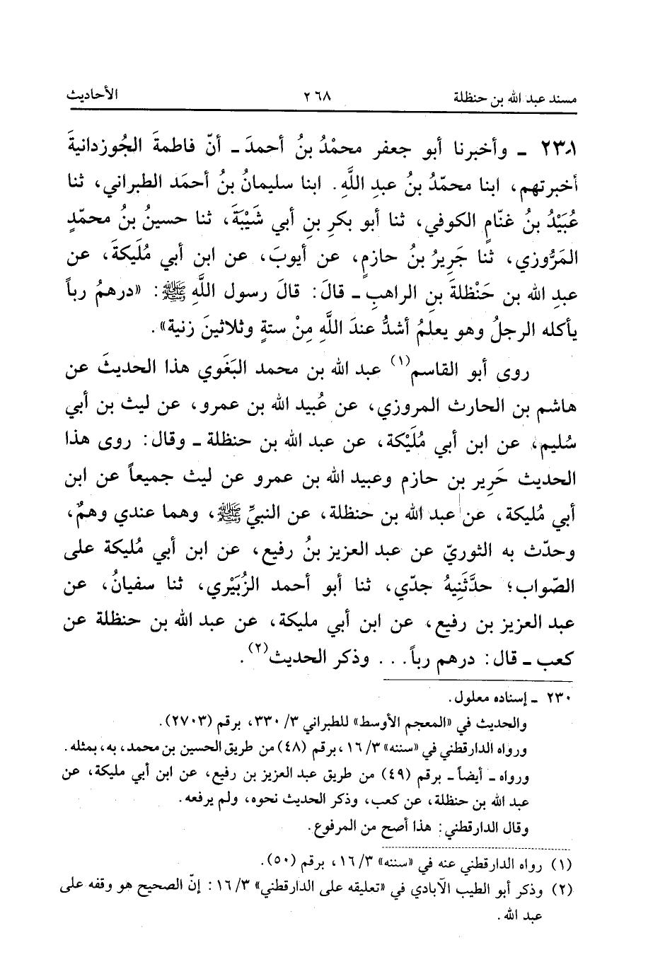 ٢٣٠ - وَأَخْبَرَنَا أَبُو جَعْفَرٍ مُحَمَّدُ بْنُ أَحْمَدَ، أَنَّ فَاطِمَةَ الْجُوزْدَانِيَّةَ أَخْبَرَتْهُمْ، أَبْنَا مُحَمَّدُ بْنُ عَبْدِ اللهِ، أَبْنَا سُلَيْمَانُ بْنُ أَحْمَدَ الطَّبَرَانِيُّ، ثَنَا عُبَيْدُ بْنُ غَنَّامٍ الْكُوفِيُّ، ثَنَا أَبُو بَكْرِ بْنُ أَبِي شَيْبَةَ، ثَنَا حُسَيْنُ بْنُ مُحَمَّدٍ الْمَرْوَزِيُّ، ثَنَا جَرِيرُ بْنُ حَازِمٍ، عَنْ أَيُّوبَ، عَنِ ابْنِ أَبِي مُلَيْكَةَ، عَنْ عَبْدِ اللهِ بْنِ حَنْظَلَةَ بْنِ الرَّاهِبِ قَالَ: قَالَ رَسُولُ اللهِ صَلَّى اللهُ عَلَيْهِ وَسَلَّمَ: «دِرْهَمُ رِبًا يَأْكُلُهُ الرَّجُلُ وَهُوَ يَعْلَمُ أَشَدُّ عِنْدَ اللهِ مِنْ سِتَّةٍ وَثَلَاثِينَ زَنْيَةً».