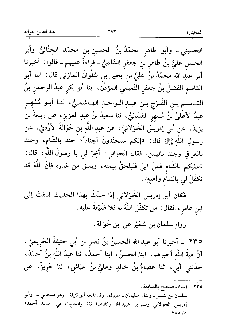 سُلَيْمَانَ بْنِ سُمَيْرٍ، عَنِ ابْنِ حَوَالَةَ وَكَانَ مِنْ أَصْحَابِ رَسُولِ اللهِ صَلَّى اللهُ عَلَيْهِ وَسَلَّمَ عَنِ النَّبِيِّ صَلَّى اللهُ عَلَيْهِ وَسَلَّمَ أَنَّهُ قَالَ: «سَيَكُونُ أَجْنَادٌ مُجَنَّدَةٌ، شَامٌ وَيَمَنٌ وَعِرَاقٌ، وَاللهُ أَعْلَمُ بِأَيِّهَا بَدَأَ، وَعَلَيْكُمْ بِالشَّامِ أَلَا وَعَلَيْكُمْ بِالشَّامِ أَلَا وَعَلَيْكُمْ بِالشَّامِ، فَمَنْ كَرِهَ فَعَلَيْهِ بِيَمَنِهِ، وَلْيَسْقِ مِنْ غُدُرِهِ، فَإِنَّ اللهَ عَزَّ وَجَلَّ تَوَكَّلَ لِي بِالشَّامِ وَأَهْلِهِ».