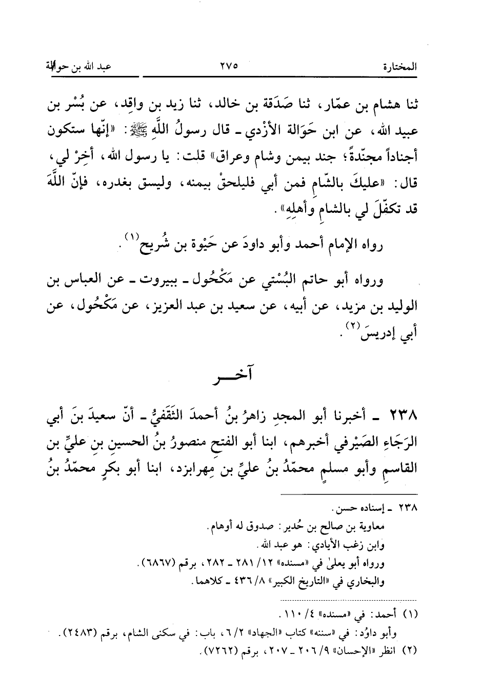 إِبْرَاهِيمَ بْنِ عَلِيِّ بْنِ الْمُقْرِئِ، أَبْنَا مُحَمَّدُ بْنُ الْحَسَنِ بْنِ قُتَيْبَةَ، ثَنَا حَرْمَلَةُ بْنُ يَحْيَى، ثَنَا ابْنُ وَهْبٍ، حَدَّثَنِي مُعَاوِيَةُ، عَنْ ضَمْرَةَ بْنِ حَبِيبٍ، عَنِ ابْنِ زُغْبٍ الْإِيَادِيِّ قَالَ: نَزَلَ ابْنُ حَوَالَةَ الْأَزْدِيُّ (صَاحِبُ رَسُولِ اللهِ صَلَّى اللهُ عَلَيْهِ وَسَلَّمَ) عَلَيَّ فَسَمِعْتُهُ يُحَدِّثُ عَنْ رَسُولِ اللهِ صَلَّى اللهُ عَلَيْهِ وَسَلَّمَ، قَالَ: «بُعِثْنَا حَوْلَ الْمَدِينَةِ لِنَغْنَمَ، فَقَدِمْنَا وَلَمْ نَغْنَمْ شَيْئًا، فَلَمَّا رَأَى رَسُولُ اللهِ صَلَّى اللهُ عَلَيْهِ وَسَلَّمَ الَّذِي نَزَلَ بِنَا مِنَ الْجَهْدِ، قَالَ: اللَّهُمَّ لَا تَكِلْهُمْ إِلَيَّ فَأَضْعُفَ عَنْهُمْ، وَلَا تَكِلْهُمْ إِلَى النَّاسِ فَيَهُونُوا عَلَيْهِمْ، وَلَا تَكِلْهُمْ إِلَى أَنْفُسِهِمْ فَيَعْجِزُوا عَنْهَا، وَلَكِنْ تَوَحَّدْ بِأَرْزَاقِهِمْ، ثُمَّ قَالَ: لَيُفْتَحَنَّ عَلَيْكُمُ الشَّامُ وَلَيُقْتَسَمَنَّ كُنُوزُ فَارِسَ وَالرُّومِ وَلَيَكُونَنَّ لِأَحَدِكُمْ مِنَ الْمَالِ كَذَا وَكَذَا، وَحَتَّى أَنَّ أَحَدَكُمْ لَيُعْطَى مِائَةَ دِينَارٍ فَيَسْخَطُهَا.