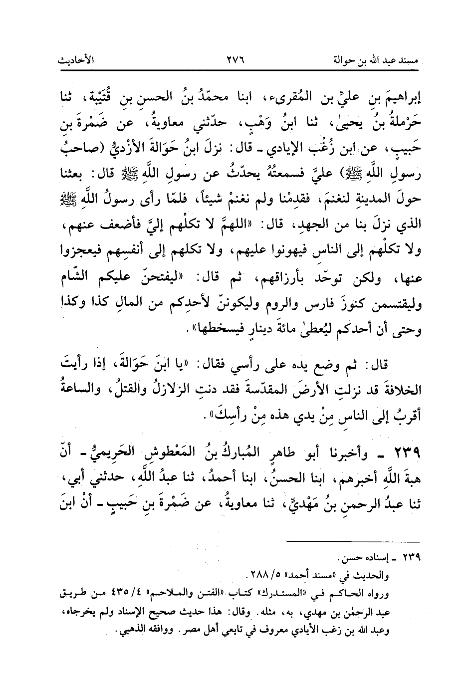 زُغْبٍ الْإِيَادِيَّ حَدَّثَهُ قَالَ: «نَزَلَ عَلَيَّ عَبْدُ اللهِ بْنُ حَوَالَةَ الْأَزْدِيُّ فَقَالَ لِي - وَإِنَّهُ لَنَازِلٌ عَلَيَّ فِي بَيْتِي -: بَعَثَنَا رَسُولُ اللهِ صَلَّى اللهُ عَلَيْهِ وَسَلَّمَ حَوْلَ الْمَدِينَةِ عَلَى أَقْدَامِنَا لِنَغْنَمَ، فَرَجَعْنَا وَلَمْ نَغْنَمْ شَيْئًا، وَعَرَفَ الْجَهْدَ فِي وُجُوهِنَا فَقَامَ فِينَا فَقَالَ: اللَّهُمَّ لَا تَكِلْهُمْ إِلَيَّ فَأَضْعُفَ، وَلَا تَكِلْهُمْ إِلَى أَنْفُسِهِمْ فَيَعْجِزُوا عَنْهَا، وَلَا تَكِلْهُمْ إِلَى النَّاسِ فَيَسْتَأْثِرُوا عَلَيْهِمْ، ثُمَّ قَالَ: لَيُفْتَحَنَّ لَكُمُ الشَّامُ وَالرُّومُ وَفَارِسُ - أَوِ الرُّومُ وَفَارِسُ - حَتَّى يَكُونَ لِأَحَدِكُمْ مِنَ الْإِبِلِ كَذَا وَكَذَا وَمِنَ الْبَقَرِ كَذَا، وَكَذَا مِنَ الْغَنَمِ، حَتَّى يُعْطَى أَحَدُهُمْ مِائَةَ دِينَارٍ فَيَسْخَطَهَا ... ثُمَّ وَضَعَ يَدَهُ عَلَى رَأْسِي أَوْ عَلَى هَامَتِي فَقَالَ: يَا ابْنَ حَوَالَةَ إِذَا رَأَيْتَ الْخِلَافَةَ قَدْ نَزَلَتِ الْأَرْضَ الْمُقَدَّسَةَ فَقَدْ دَنَتِ الزَّلَازِلُ وَالْبَلَايَا وَالْأُمُورُ الْعِظَامُ، وَالسَّاعَةُ يَوْمَئِذٍ أَقْرَبُ إِلَى النَّاسِ مِنْ يَدِي هَذِهِ مِنْ رَأْسِكَ».