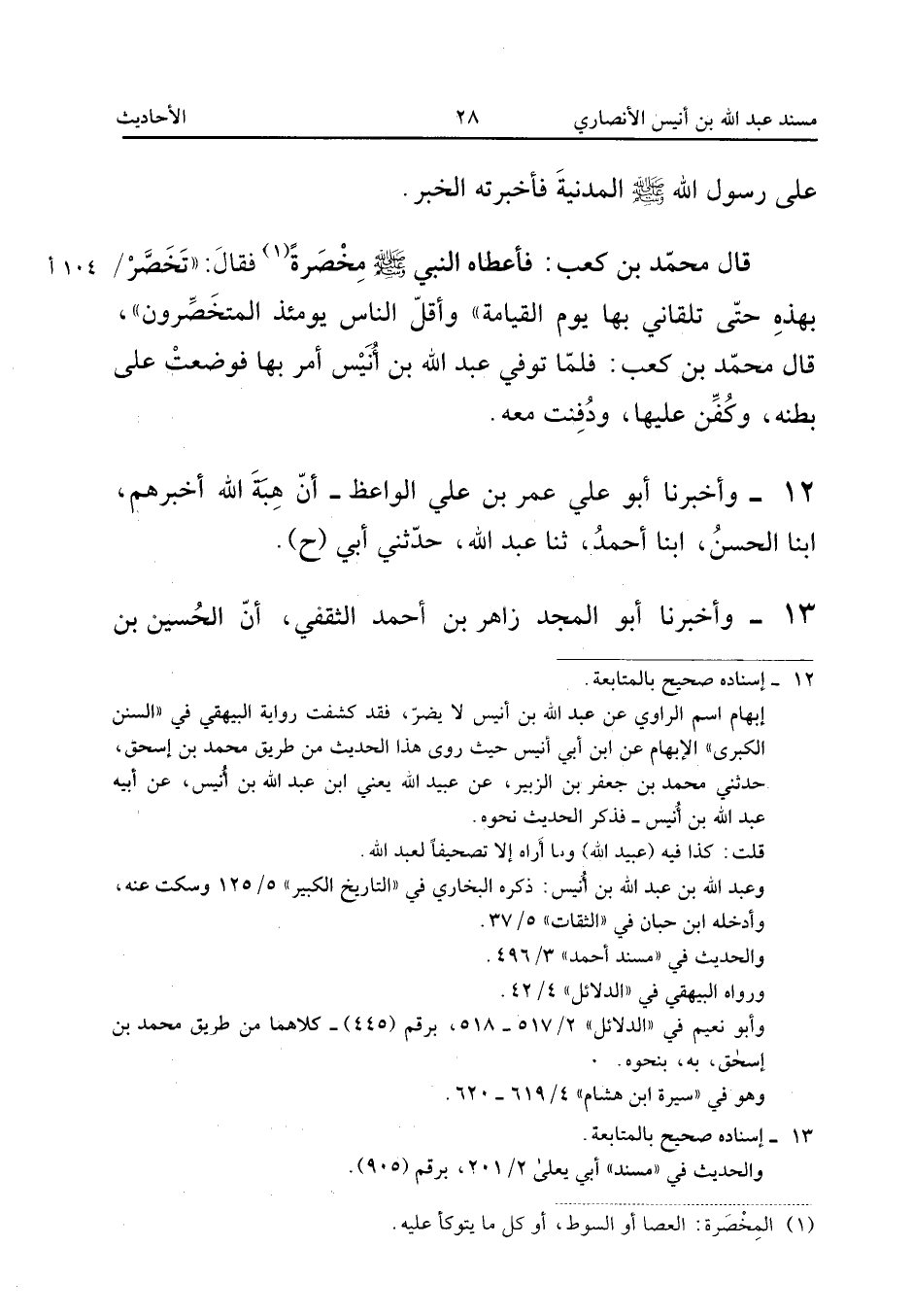 لِهَذَا الرَّجُلِ، جَاءَكَ لِذَلِكَ، قَالَ: أَجَلْ، أَنَا فِي ذَلِكَ، قَالَ: فَمَشَيْتُ مَعَهُ شَيْئًا حَتَّى إِذَا أَمْكَنَنِي حَمَلْتُ عَلَيْهِ بِالسَّيْفِ حَتَّى قَتَلْتُهُ، ثُمَّ خَرَجْتُ وَتَرَكْتُ ظَعَايِنَهُ مُكِبَّاتٍ عَلَيْهِ، فَلَمَّا قَدِمْتُ عَلَى رَسُولِ اللهِ صَلَّى اللهُ عَلَيْهِ وَسَلَّمَ فَرَآنِي، قَالَ: قَدْ أَفْلَحَ الْوَجْهُ، قَالَ: قُلْتُ: قَتَلْتُهُ يَا رَسُولَ اللهِ، قَالَ: صَدَقْتَ، قَالَ: ثُمَّ قَامَ رَسُولُ اللهِ صَلَّى اللهُ عَلَيْهِ وَسَلَّمَ فَدَخَلَ بِي بَيْتَهُ فَأَعْطَانِي عَصًا، فَقَالَ: أَمْسِكْ هَذِهِ عِنْدَكَ يَا عَبْدَ اللهِ بْنَ أُنَيْسٍ، قَالَ: فَخَرَجْتُ بِهَا عَلَى النَّاسِ، فَقَالُوا: مَا هَذِهِ الْعَصَا؟ قَالَ: قُ ْتُ: أَعْطَانِيهَا رَسُولُ اللهِ صَلَّى اللهُ عَلَيْهِ وَسَلَّمَ، فَأَمَرَنِي أَنْ أُمْسِكَهَا، قَالُوا: أَوَلَا تَرْجِعُ إِلَى رَسُولِ اللهِ صَلَّى اللهُ عَلَيْهِ وَسَلَّمَ فَتَسْأَلَهُ عَنْ ذَلِكَ، قَالَ: فَرَجَعْتُ إِلَى رَسُولِ اللهِ صَلَّى اللهُ عَلَيْهِ وَسَلَّمَ فَقُلْتُ: يَا رَسُولَ اللهِ لِمَ أَعْطَيْتَنِي هَذِهِ الْعَصَا؟ قَالَ: آيَةٌ بَيْنِي وَبَيْنَكَ يَوْمَ الْقِيَامَةِ، إِنَّ أَقَلَّ النَّاسِ الْمُخْتَصِرُونَ يَوْمَئِذٍ، قَالَ: فَقَرَنَهَا عَبْدُ اللهِ بِسَيْفِهِ، فَلَمْ تَزَلْ مَعَهُ حَتَّى إِذَا مَاتَ أَمَرَ بِهَا فَضُمَّتْ مَعَهُ فِي كَفَنِهِ، ثُمَّ دُفِنَا جَمِيعًا».