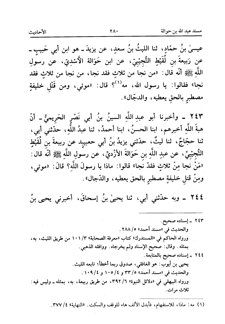 ٢٤٢ - وَأَخْبَرَنَا أَبُو عَبْدِ اللهِ الْحُسَيْنُ بْنُ أَبِي نَصْرٍ الْحَرِيمِيُّ، أَنَّ هِبَةَ اللهِ أَخْبَرَهُمْ، أَبْنَا الْحَسَنُ، أَبْنَا أَحْمَدُ، ثَنَا عَبْدُ اللهِ، حَدَّثَنِي أَبِي، ثَنَا حَجَّاجٌ، ثَنَا لَيْثٌ، حَدَّثَنِي يَزِيدُ بْنُ أَبِي حَبِيبٍ، عَنْ رَبِيعَةَ بْنِ لَقِيطٍ التُّجِيبِيِّ، عَنْ عَبْدِ اللهِ بْنِ حَوَالَةَ الْأَزْدِيِّ، عَنْ رَسُولِ اللهِ صَلَّى اللهُ عَلَيْهِ وَسَلَّمَ أَنَّهُ قَالَ: «مَنْ نَجَا مِنْ ثَلَاثٍ فَقَدْ نَجَا، قَالُوا: مَاذَا يَا رَسُولَ اللهِ؟ قَالَ: مَوْتِي، وَمِنْ قَتْلِ خَلِيفَةٍ مُصْطَبِرٍ بِالْحَقِّ يُعْطِيهِ، وَالدَّجَّالِ».