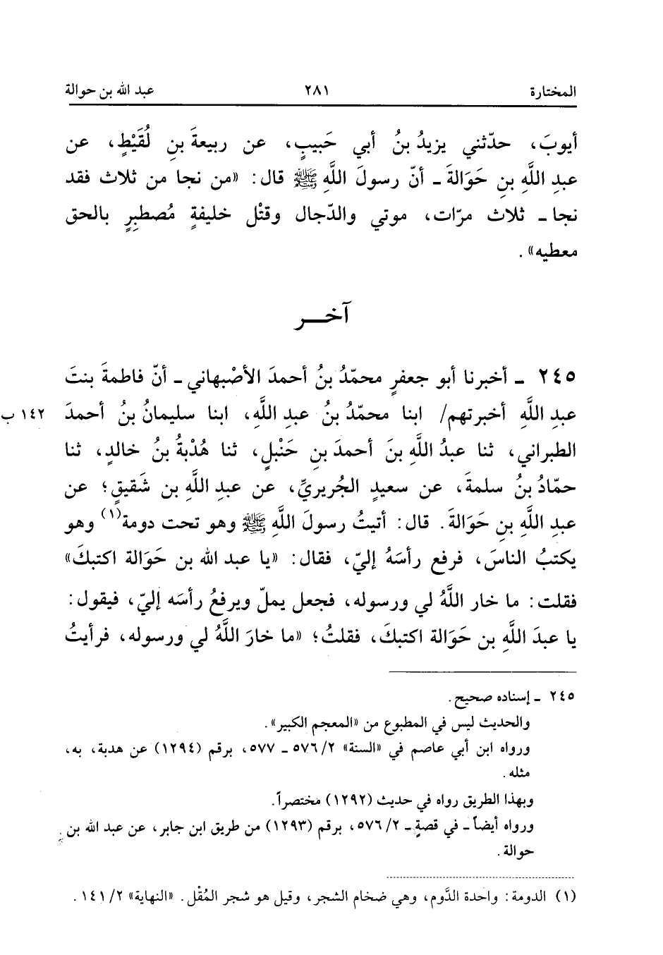 ٢٤٤ - أَخْبَرَنَا أَبُو جَعْفَرٍ مُحَمَّدُ بْنُ أَحْمَدَ الْأَصْبَهَانِيُّ، أَنَّ فَاطِمَةَ بِنْتَ عَبْدِ اللهِ أَخْبَرَتْهُمْ، أَبْنَا مُحَمَّدُ بْنُ عَبْدِ اللهِ، أَبْنَا سُلَيْمَانُ بْنُ أَحْمَدَ الطَّبَرَانِيُّ، ثَنَا عَبْدُ اللهِ بْنُ أَحْمَدَ بْنِ حَنْبَلٍ، ثَنَا هُدْبَةُ بْنُ خَالِدٍ، ثَنَا حَمَّادُ بْنُ سَلَمَةَ، عَنْ سَعِيدٍ الْجُرَيْرِيِّ، عَنْ عَبْدِ اللهِ بْنِ شَقِيقٍ، عَنْ عَبْدِ اللهِ بْنِ حَوَالَةَ قَالَ: «أَتَيْتُ رَسُولَ اللهِ صَلَّى اللهُ عَلَيْهِ وَسَلَّمَ وَهُوَ تَحْتَ دَوْمَةٍ وَهُوَ يَكْتُبُ النَّاسَ، فَرَفَعَ رَأْسَهُ إِلَيَّ فَقَالَ: يَا عَبْدَ اللهِ بْنَ حَوَالَةَ أَكْتُبُكَ؟ فَقُلْتُ: مَا خَارَ اللهُ لِي وَرَسُولُهُ، فَجَعَلَ يُمِلُّ وَيَرْفَعُ رَأْسَهُ إِلَيَّ فَيَقُولُ: يَا عَبْدَ اللهِ بْنَ حَوَالَةَ أَكْتُبُكَ؟ فَقُلْتُ: مَا خَارَ اللهُ لِي وَرَسُولُهُ، فَرَأَيْتُ